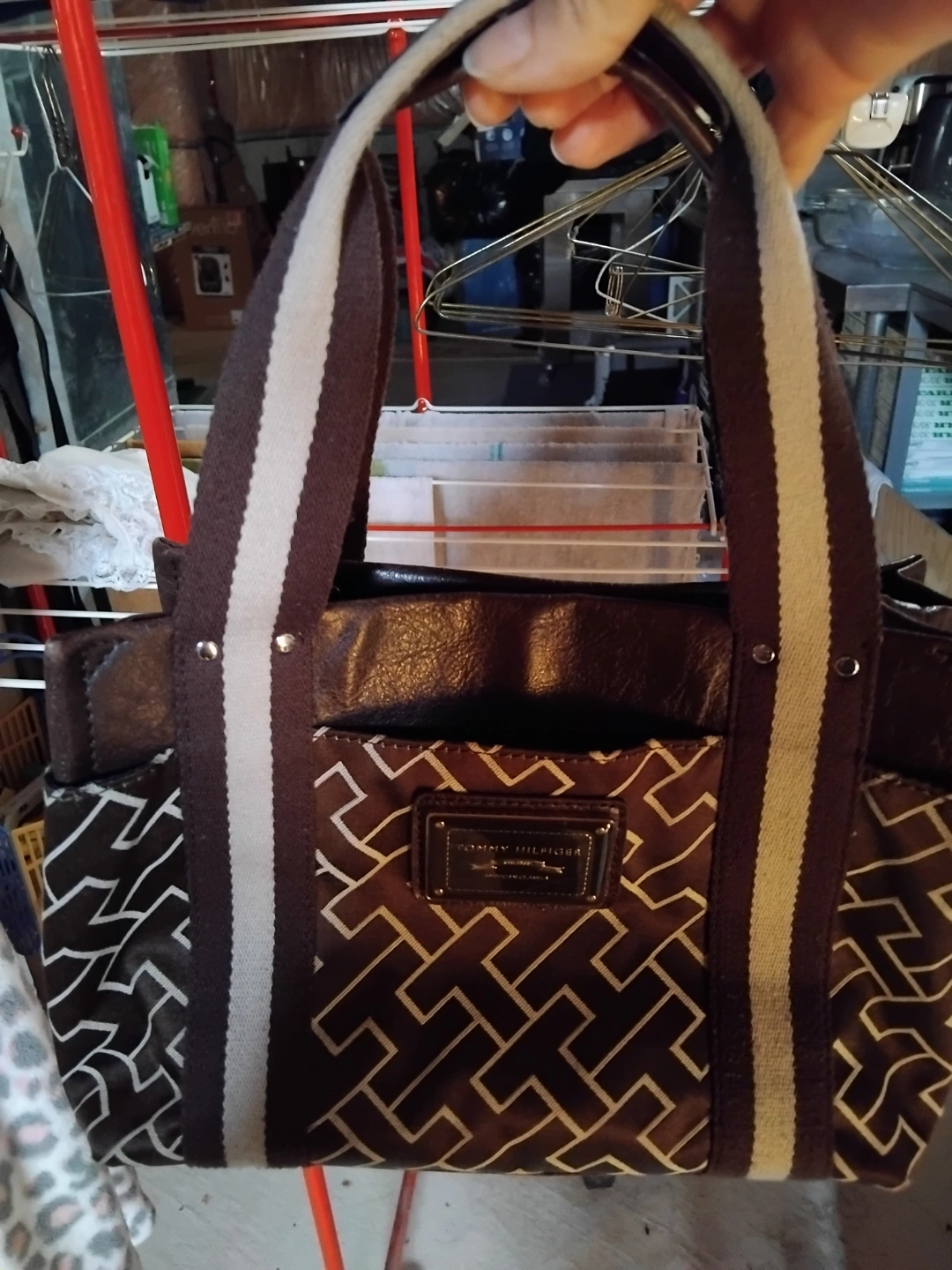 Brown and beige patterned tote bag. Features two fabric handles with brown and off-white stripes. Brown leather accents. Small Tommy Hilfiger logo plaque. Handles slightly worn.