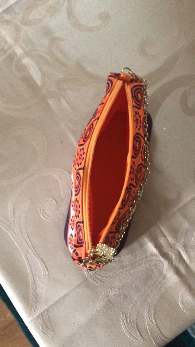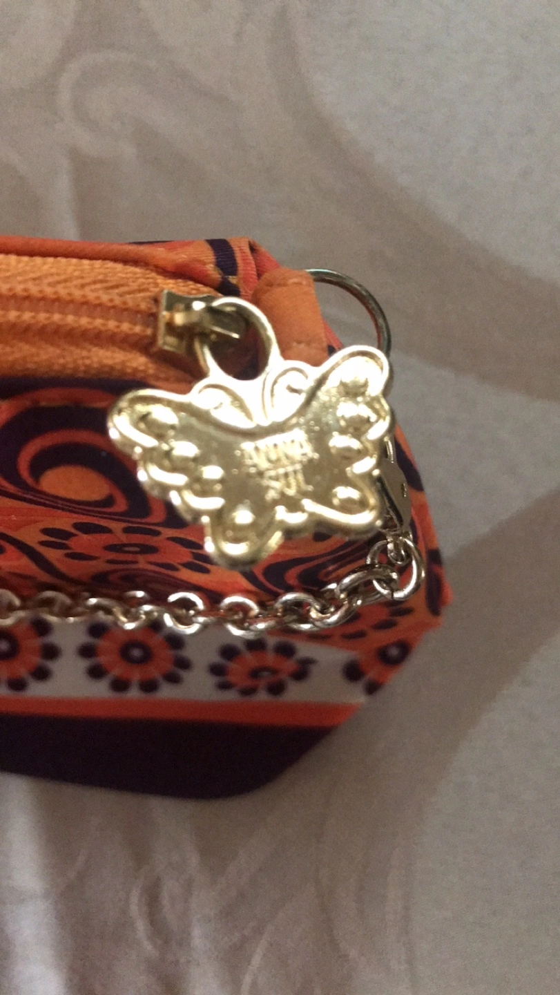 Small cosmetic bag. Orange and purple patterned fabric. Gold chain strap. Zipper closure. Butterfly charm. Excellent condition.