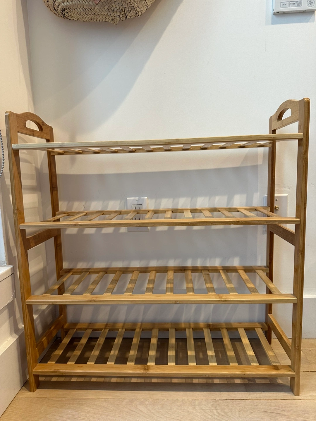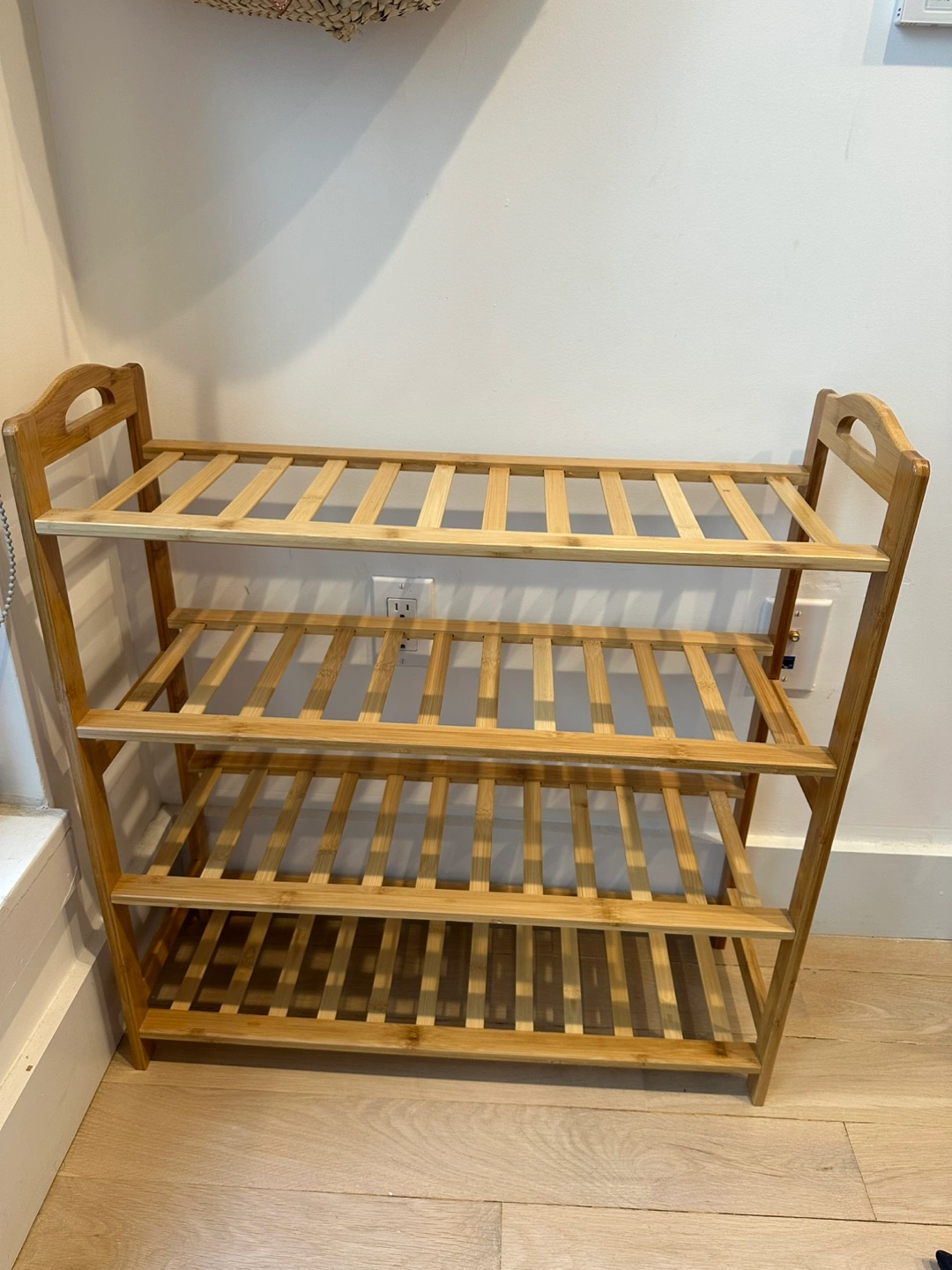 Four-tier bamboo shoe rack. Great for entryway or closet. Simple design. Great condition.