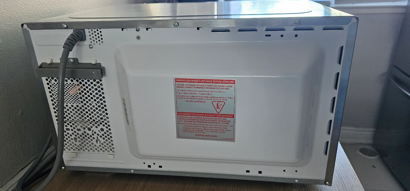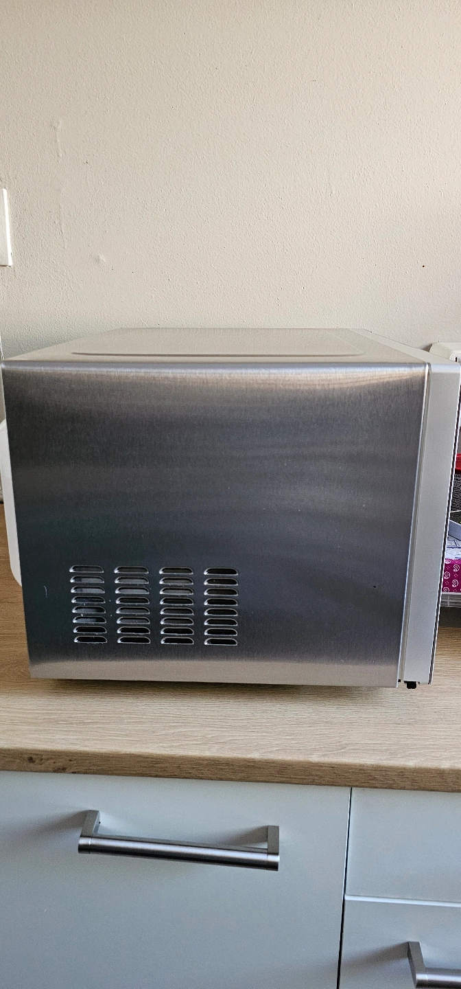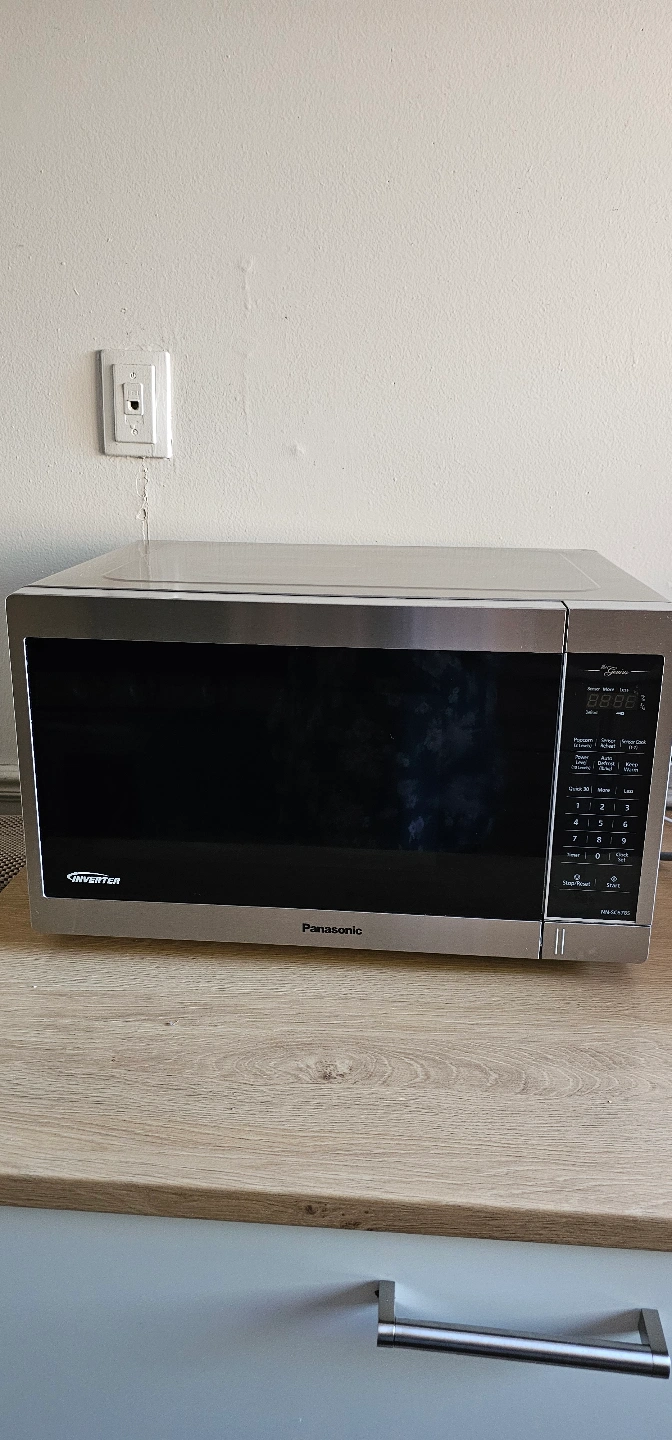 Stainless steel finish. Inverter technology. Includes glass turntable. Features various cooking options and settings. Pre-owned.