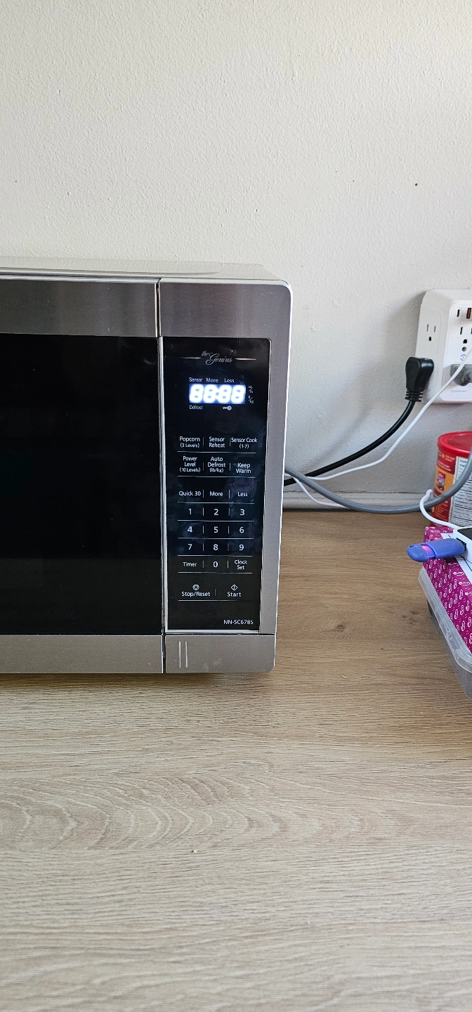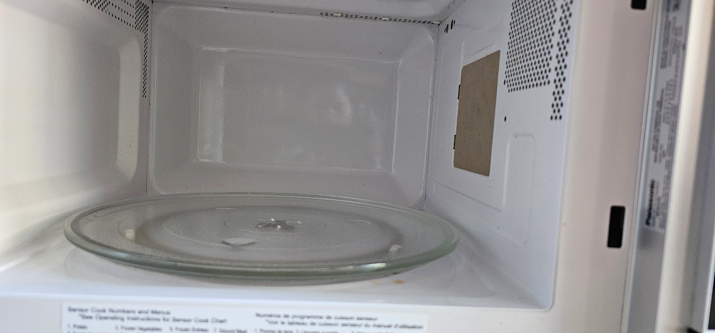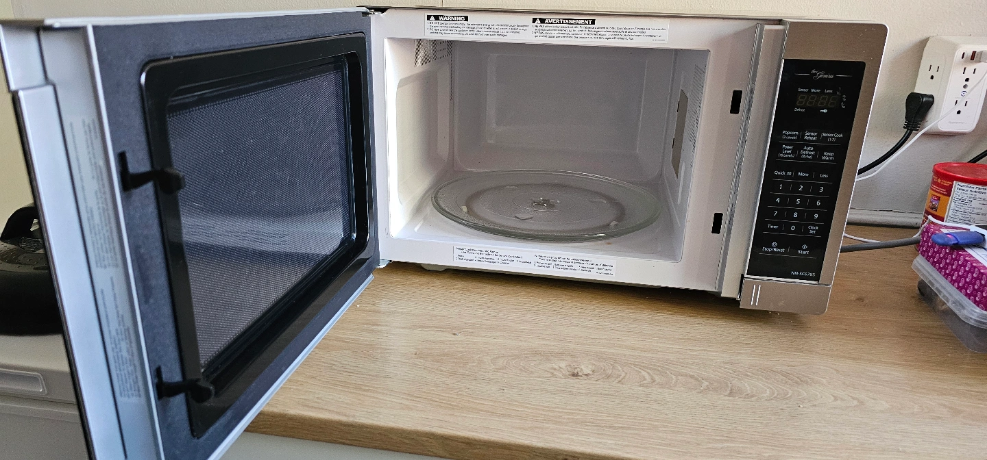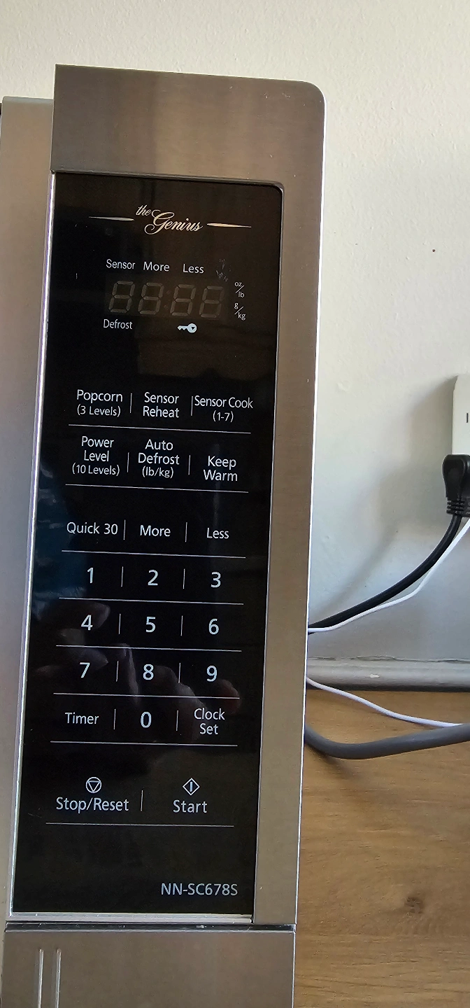 Stainless steel finish. Inverter technology. Includes glass turntable. Features various cooking options and settings. Pre-owned.