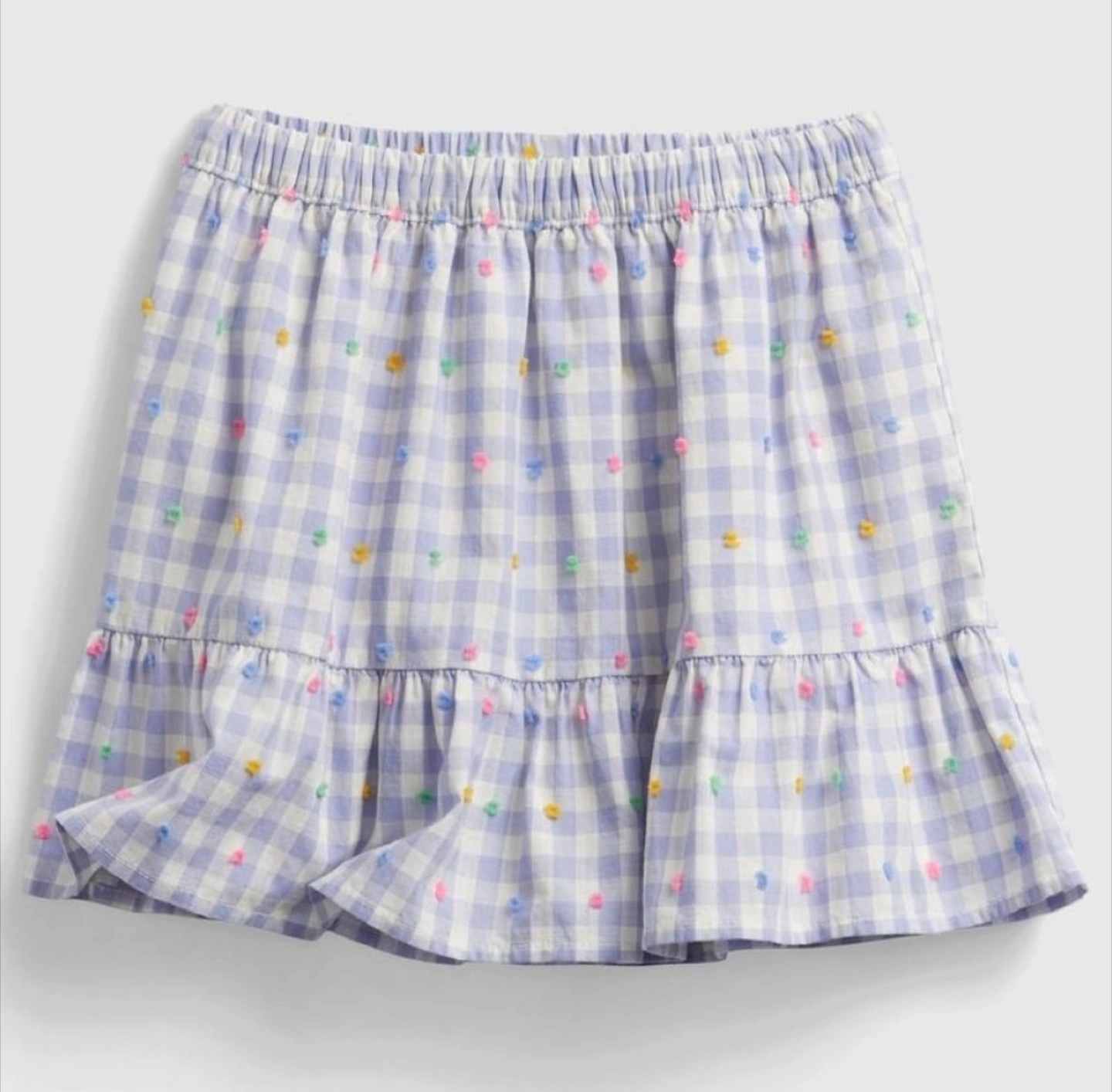 Adorable mini skirt. Lavender gingham print with colorful embroidered dots. Elastic waistband. Ruffle hem. Perfect for spring and summer.