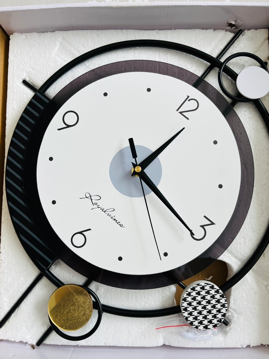 Stylish wall clock. Black metal frame. White face. Gold and black accents. Geometric design. Unique style. No return