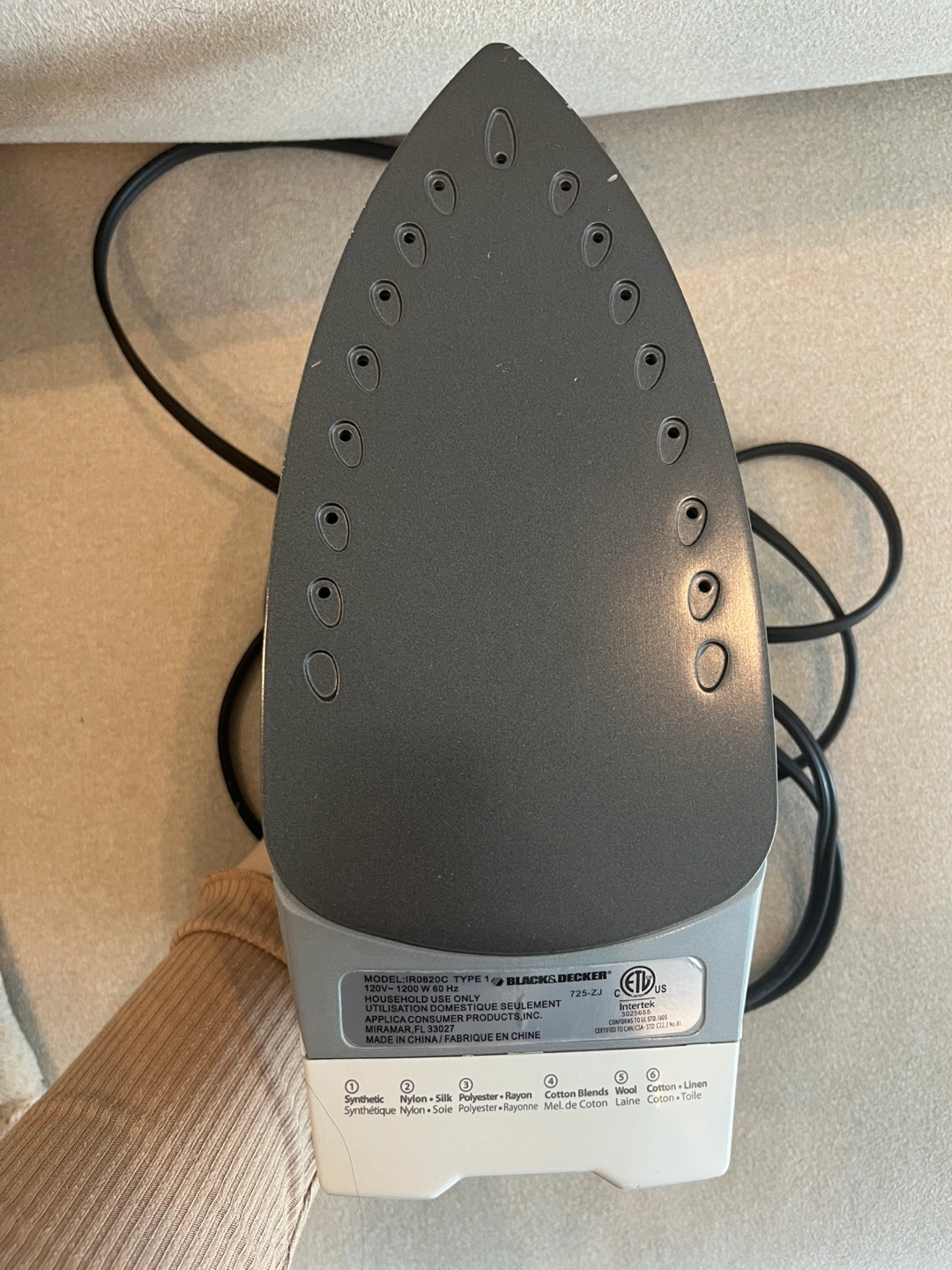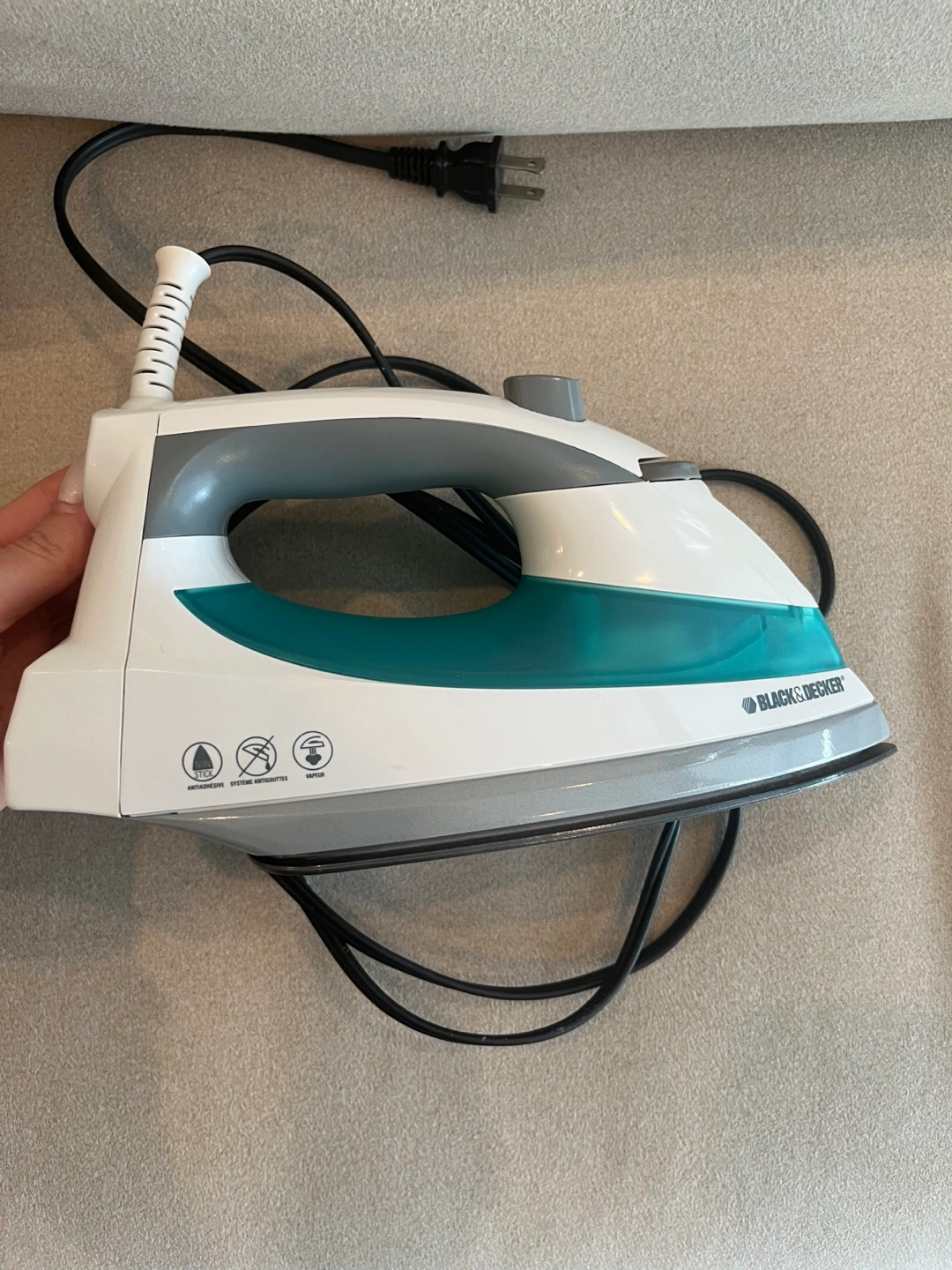 Like new, Black & Decker steam iron. Features a teal and grey design. Includes power cord. Good for everyday use. Soleplate in great condition. No instructions manual provided, however that can be found online.