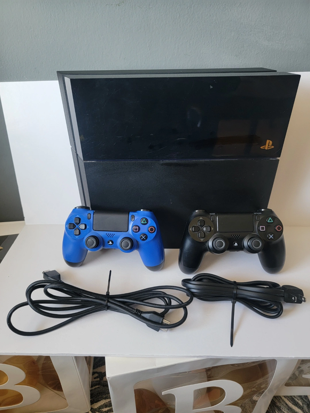PlayStation 4 console, two controllers (one blue, one black), power cables, and three games: Assassin's Creed Origins, Star Wars Battlefront, and Dark Souls Remastered. Great for gaming.