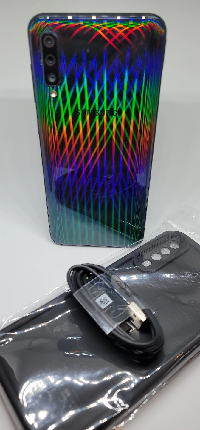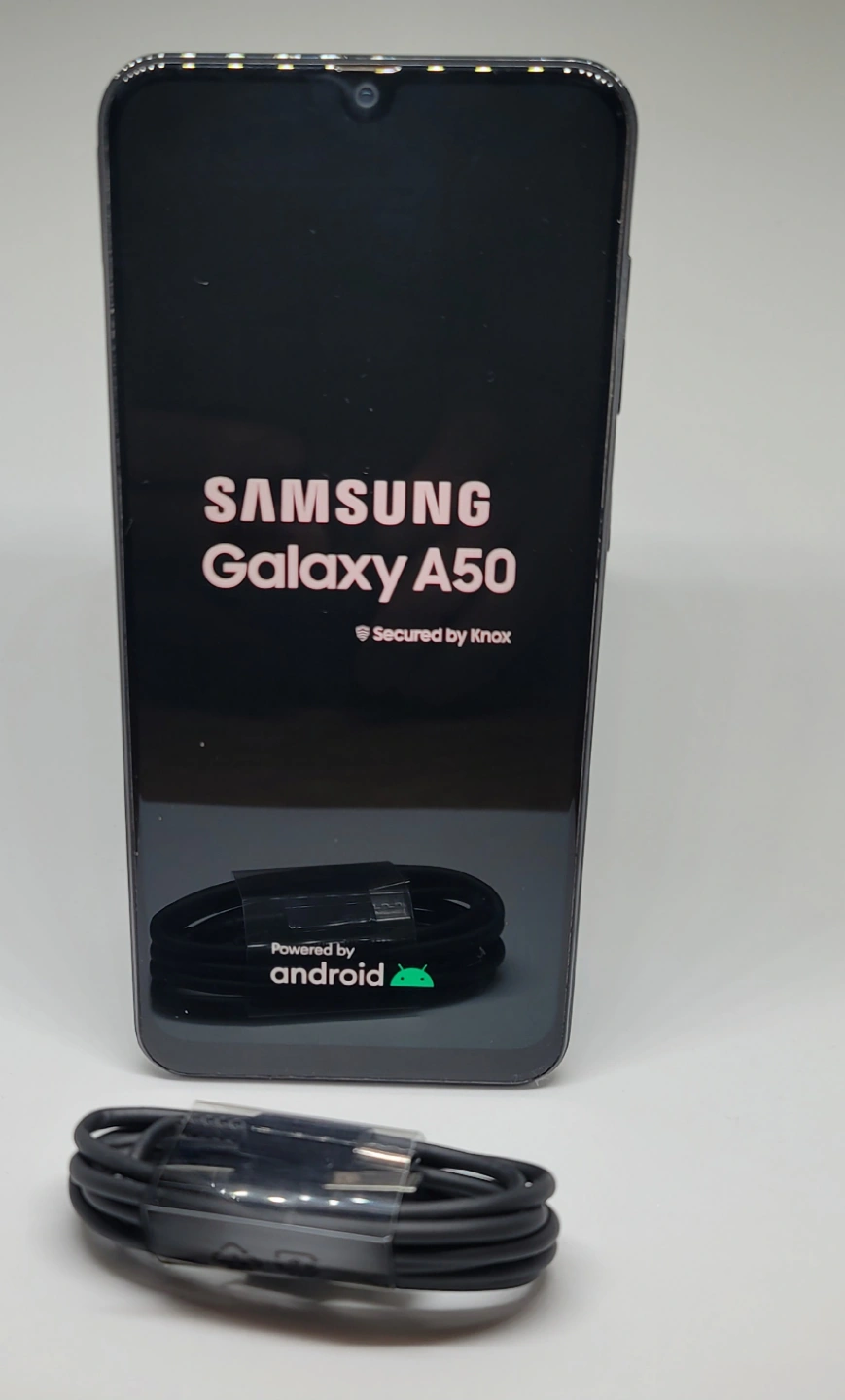 Used Samsung Galaxy A50 smartphone. Black. Includes charging cable and case. Good condition.