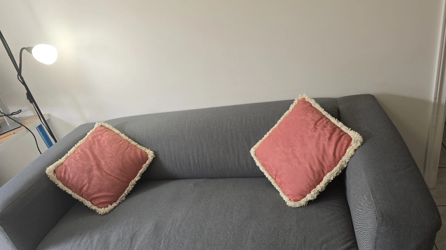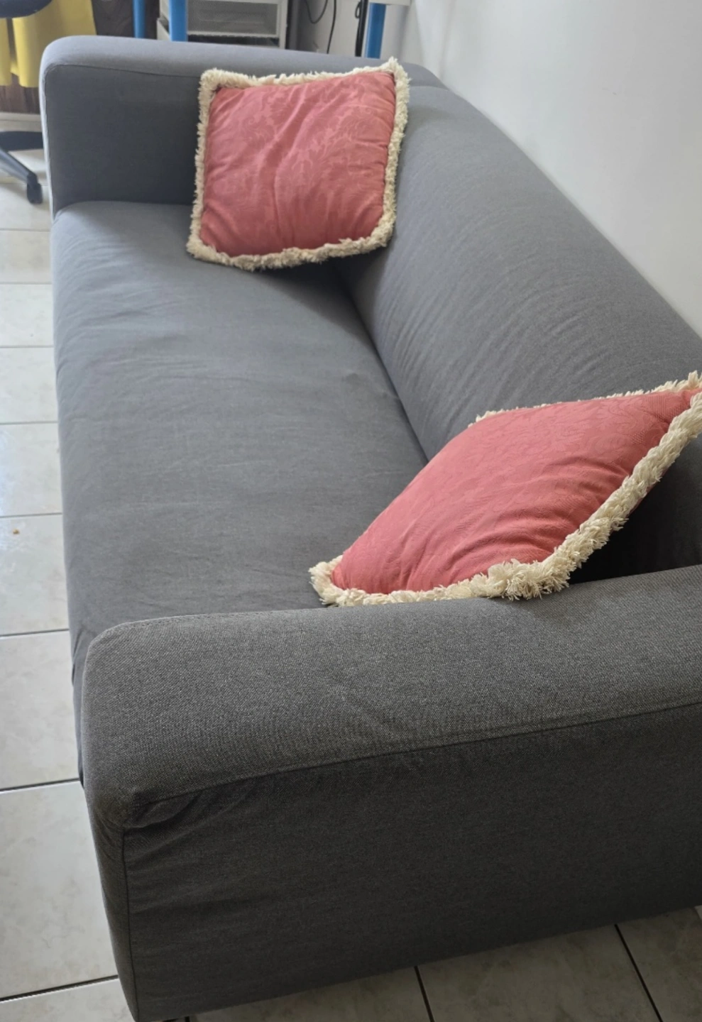 IKEA KLIPPAN Grey loveseat/Sofa. Two included coral coloured throw pillows. Good condition. Minimal Wear.
