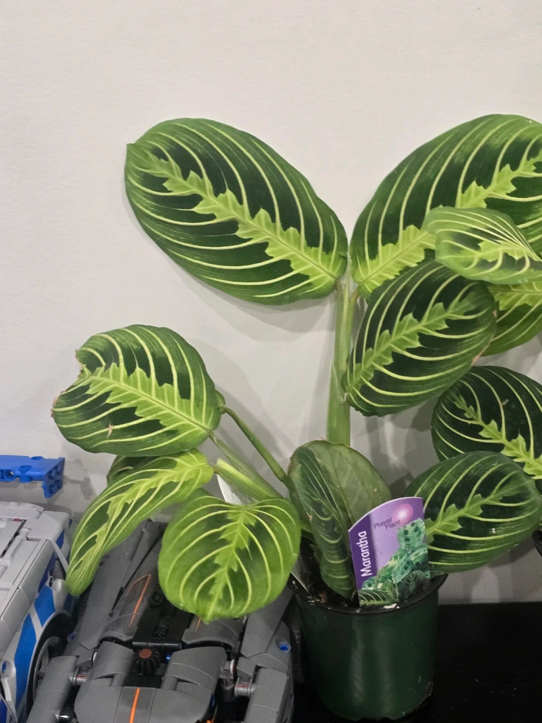 A healthy prayer plant with distinct green and white striped leaves. It's in a dark green pot with soil. The plant's leaves move throughout the day.