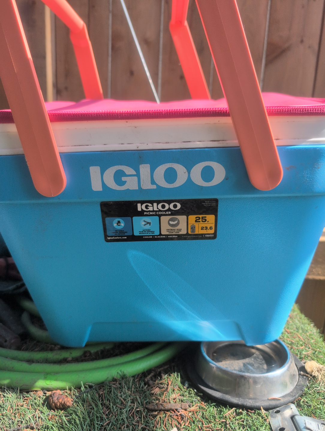 Blue and pink Igloo picnic cooler. Features two carrying handles. Lightweight and portable design. Ideal for picnics, outings, and keeping drinks and snacks cool.