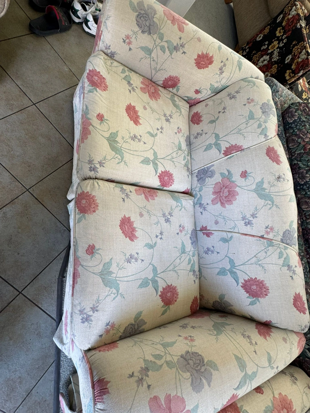 Lovely floral patterned sofa and armchair set. Made in Canada. Cream coloured fabric with pink and purple flowers. Classic style.