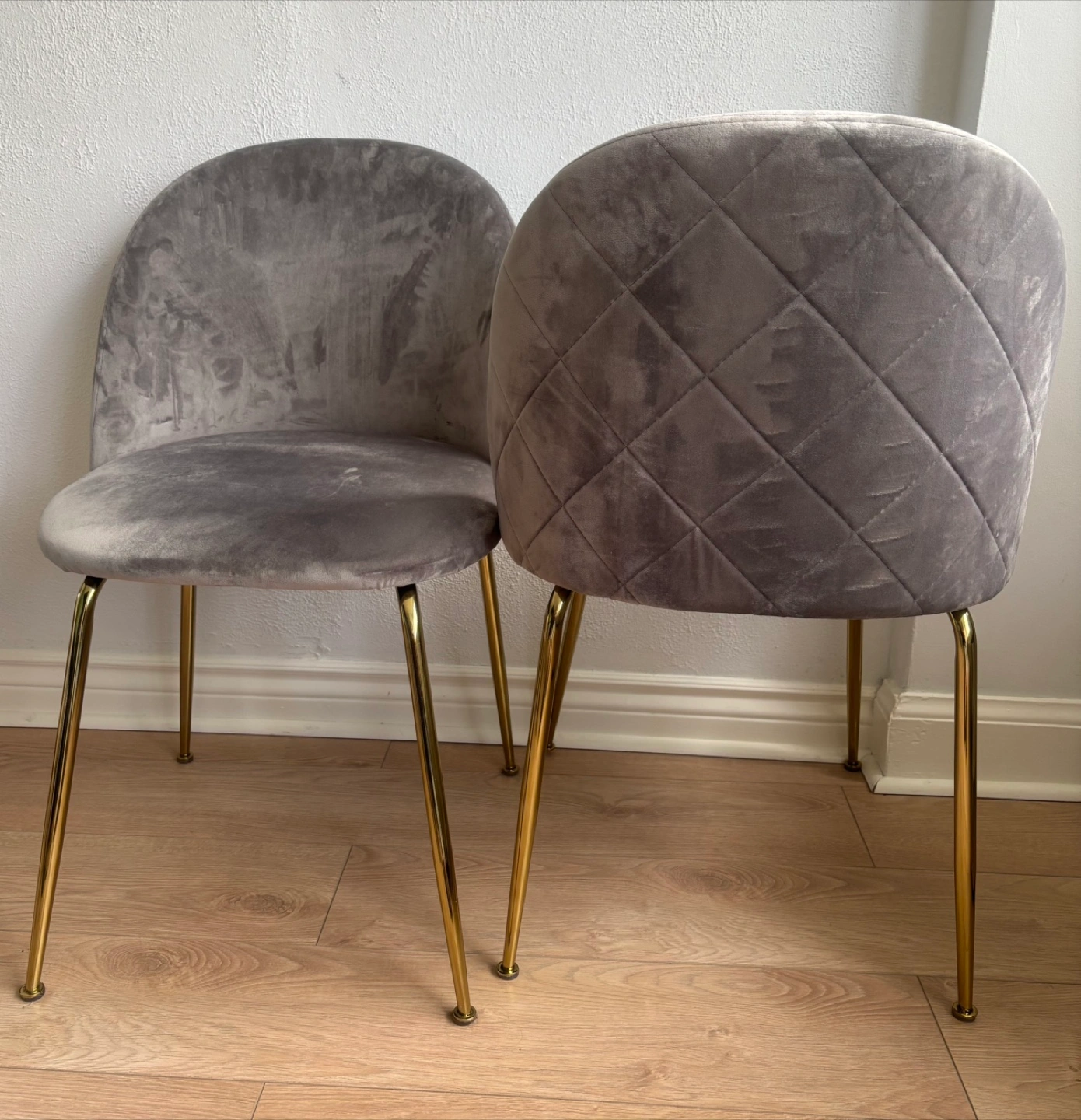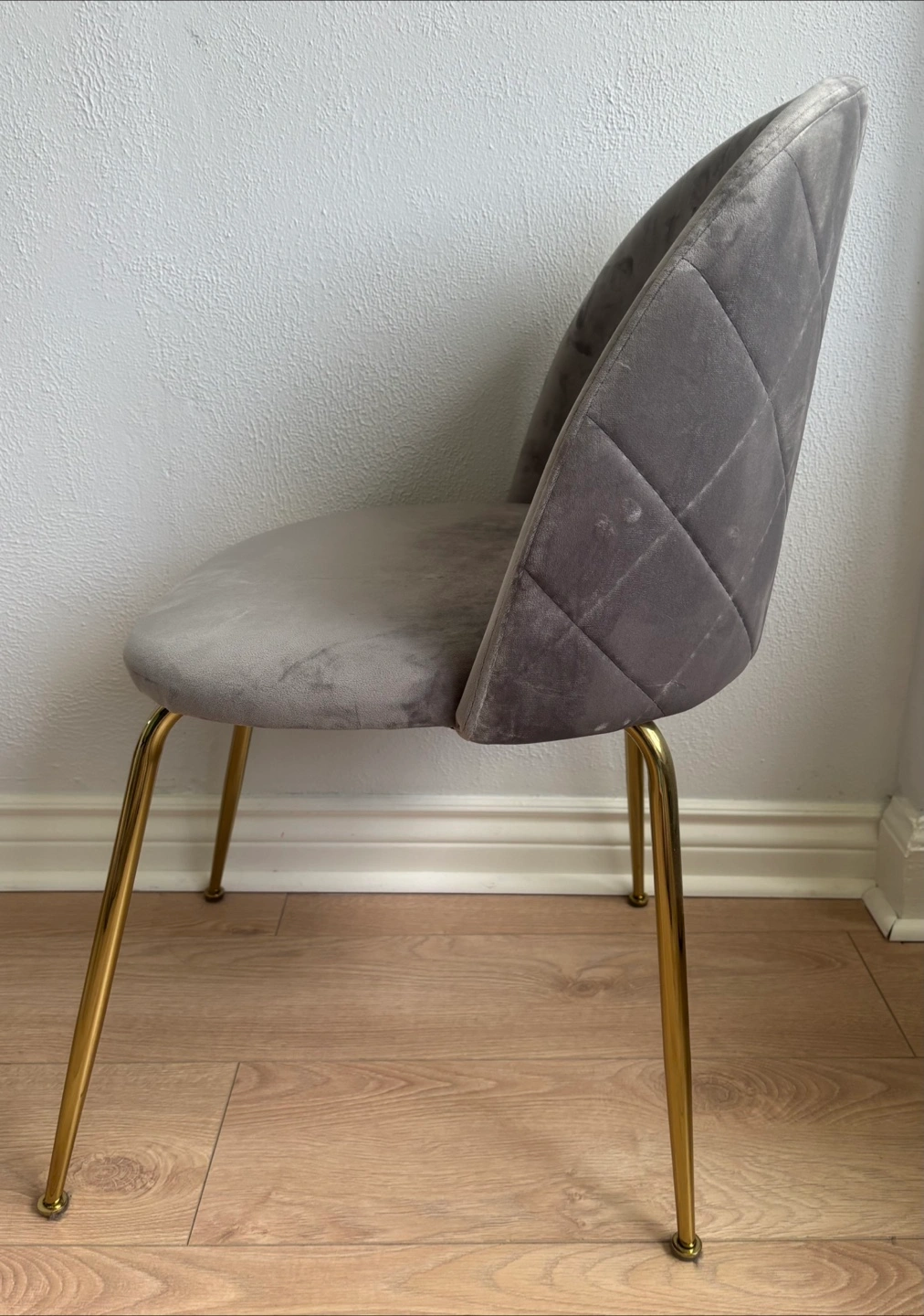 92Structube Chairs. Two grey velvet dining chairs. Gold coloured metal legs. Curved backrest features a diamond pattern on the back. Seat Width 18.5in Seat Depth 17.5in Seat Height 16.5in Back Height 32in