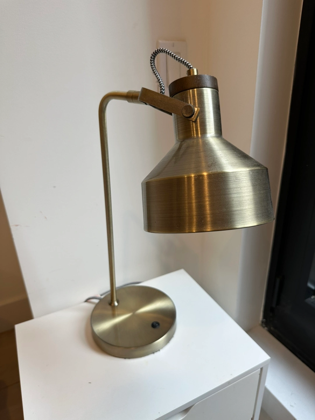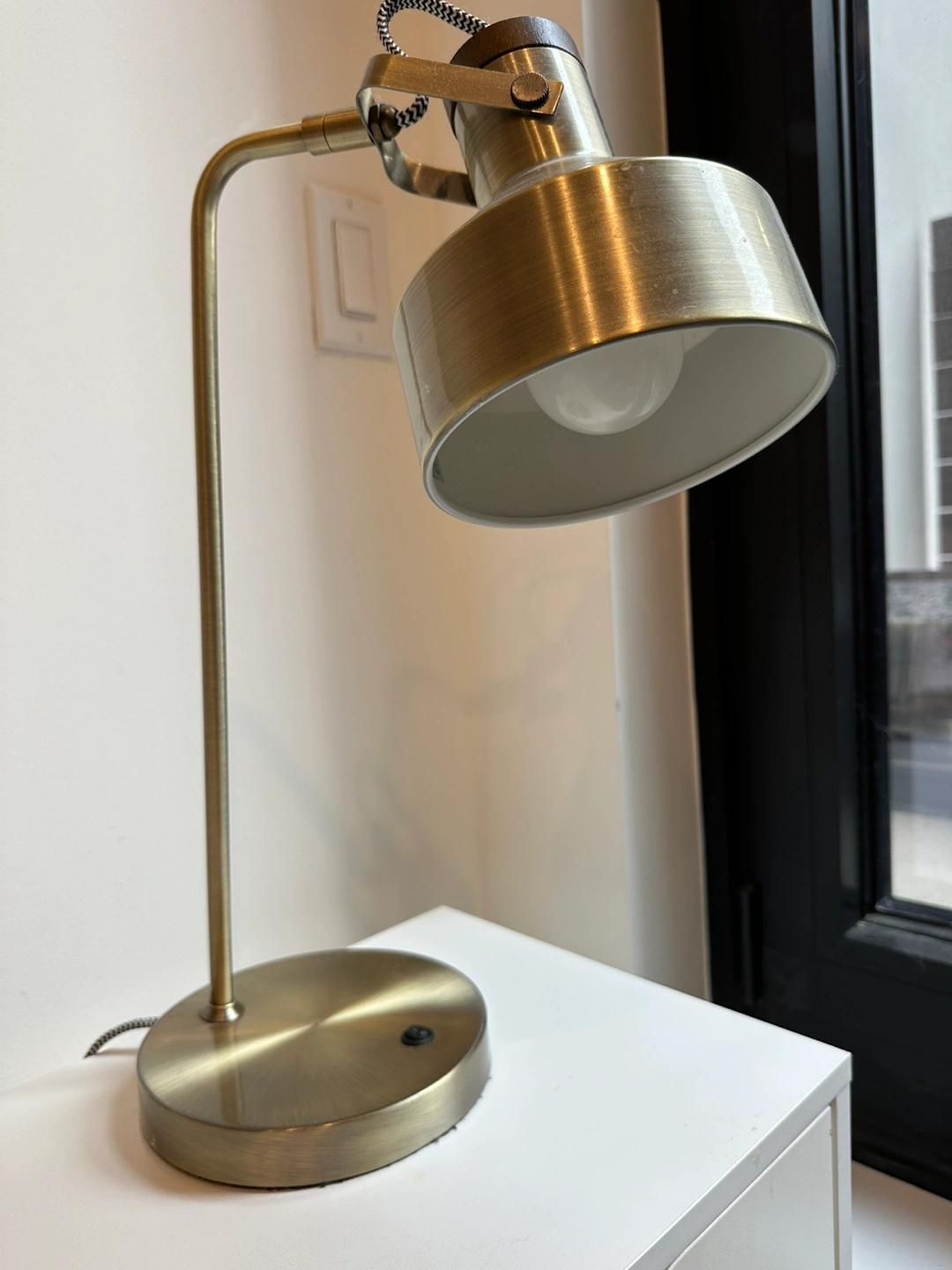 Adjustable desk lamp. Brass finish. Wood details on the arm. Simple on/off switch. Perfect for a desk or bedside table.