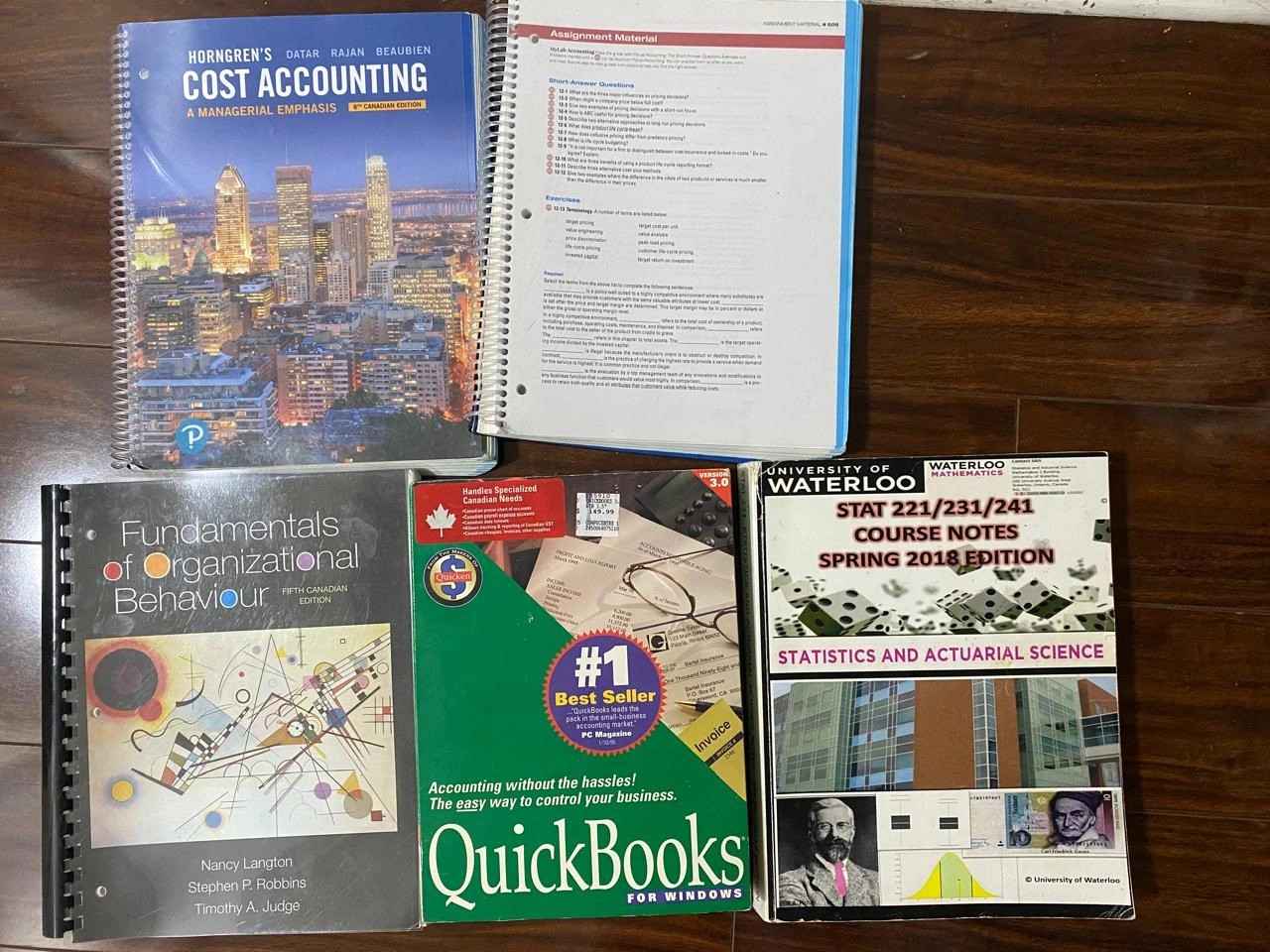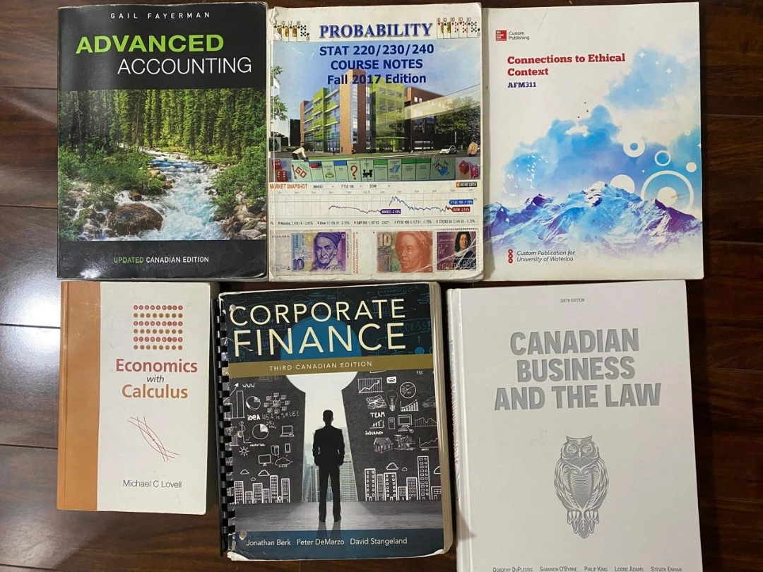 Large bundle of used university textbooks. Subjects include accounting, statistics, organizational behaviour, economics, corporate finance, and business law.