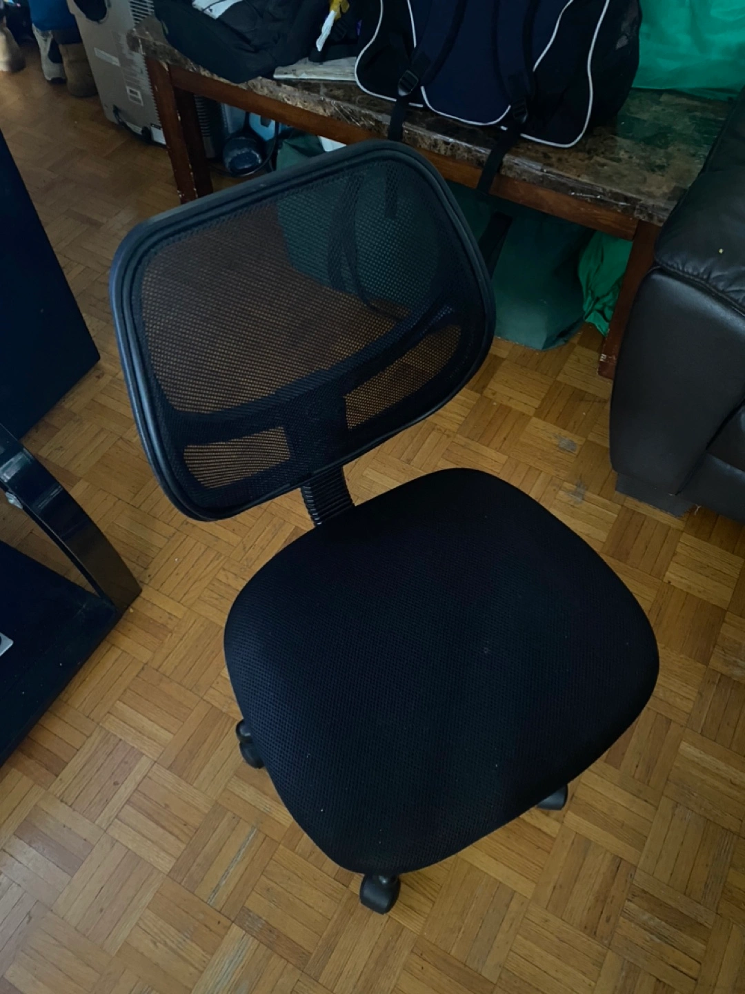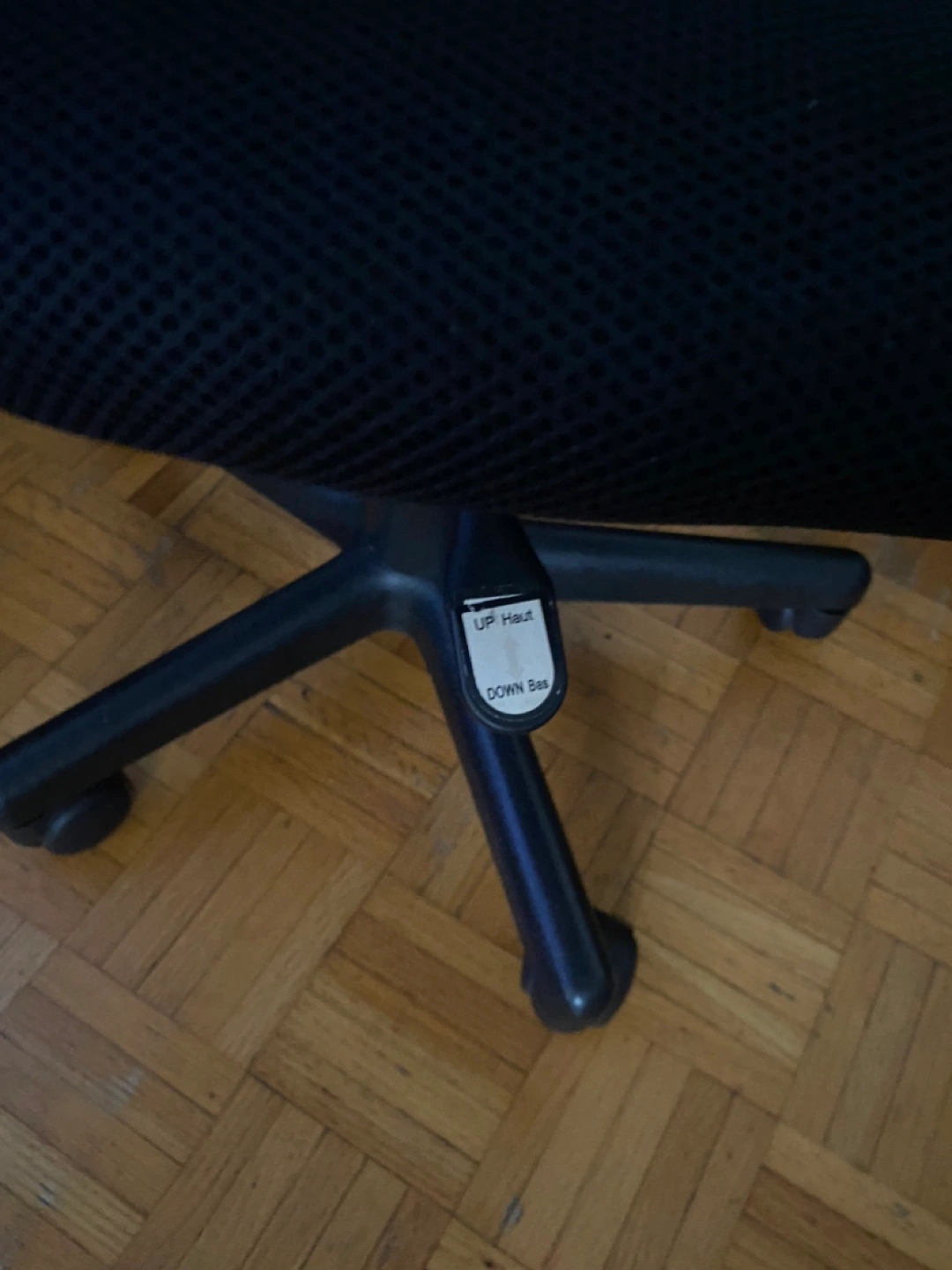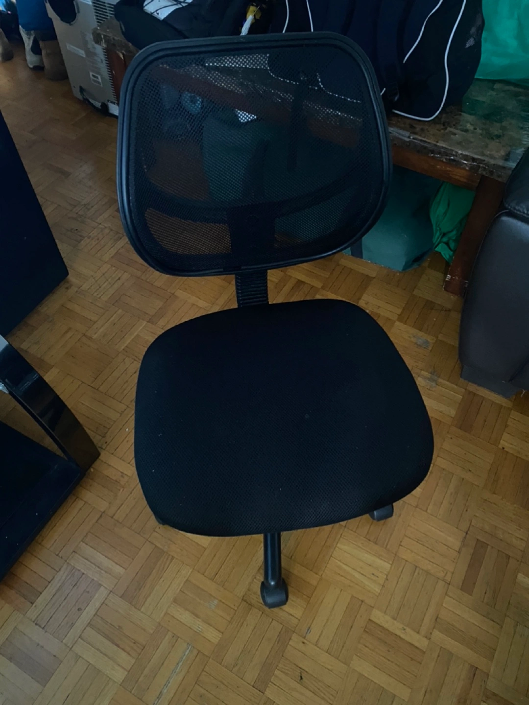 Comfortable black mesh office chair. Height adjustable. Five rolling casters. Good for home or office use.