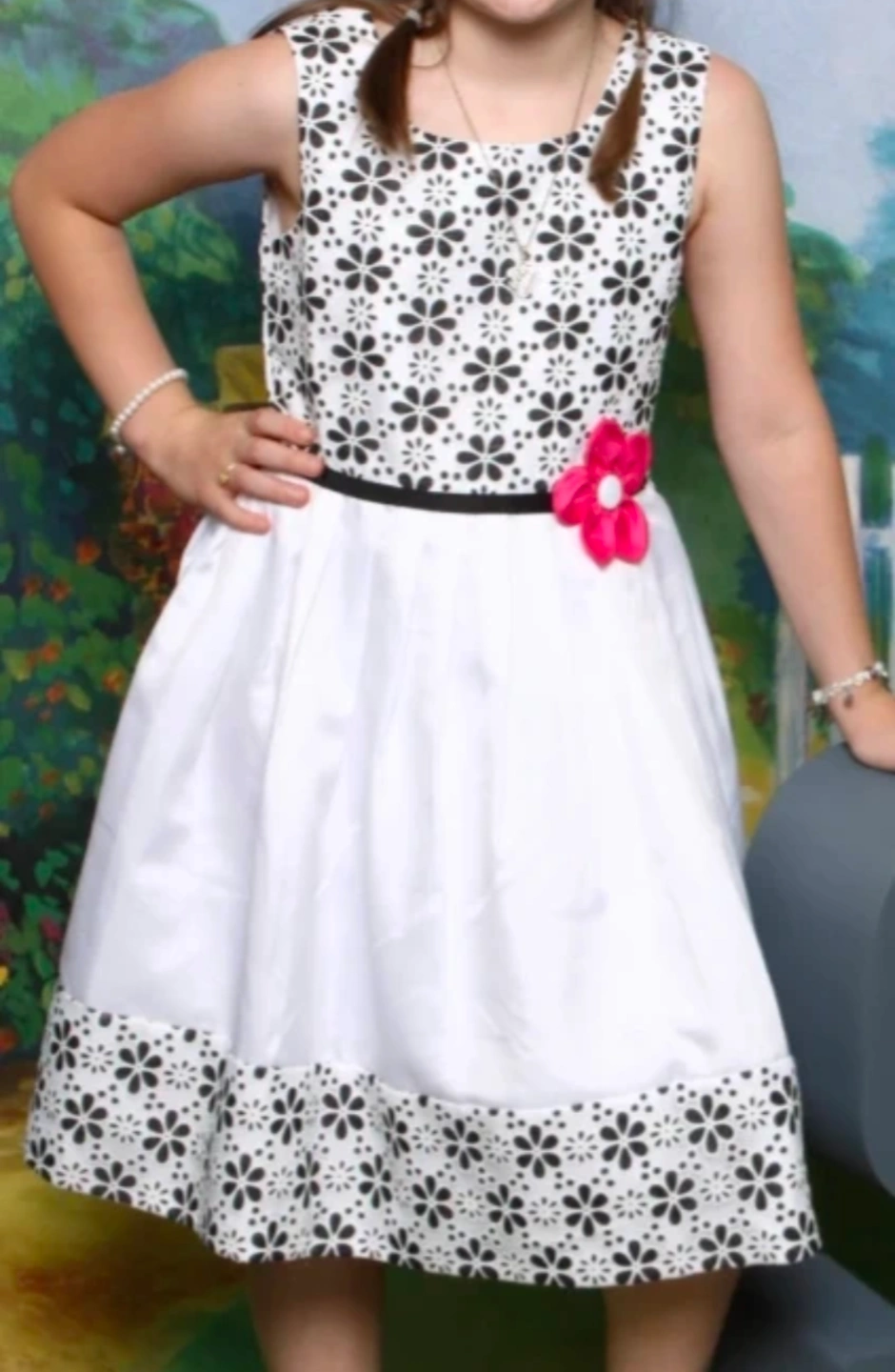 Brand new fancy girl's black and white floral dress with pink flower accent at waist. Comes with attached crinoline. Perfect for any special occasion.