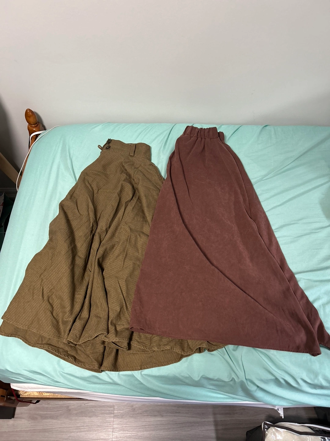 Bundle of two midi skirts. One olive green, high-waisted, possibly linen or cotton blend. The other a dark brown, high-low style, possibly suede or suede-like material. Both are in good condition.