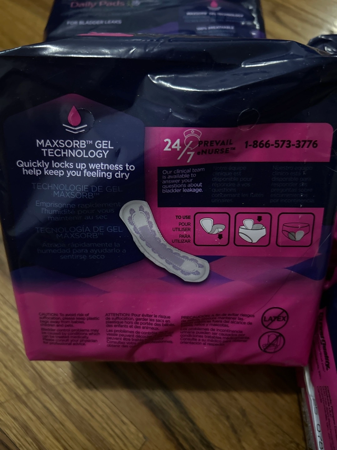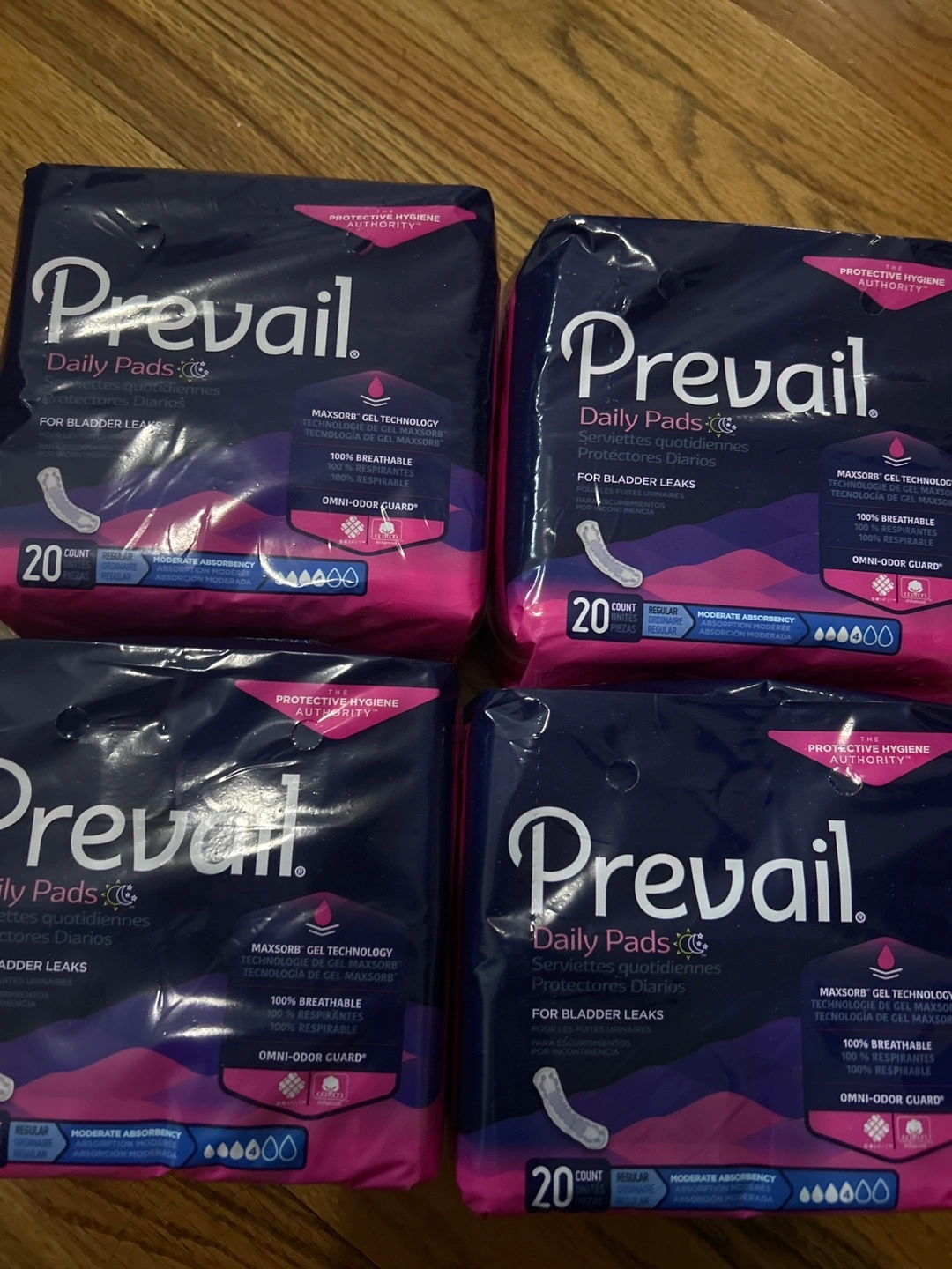 647Prevail Daily Pads Moderate absorbency. Designed for bladder leaks. Maxsorb gel technology, 20 count per pack. You will be getting 8 packs.