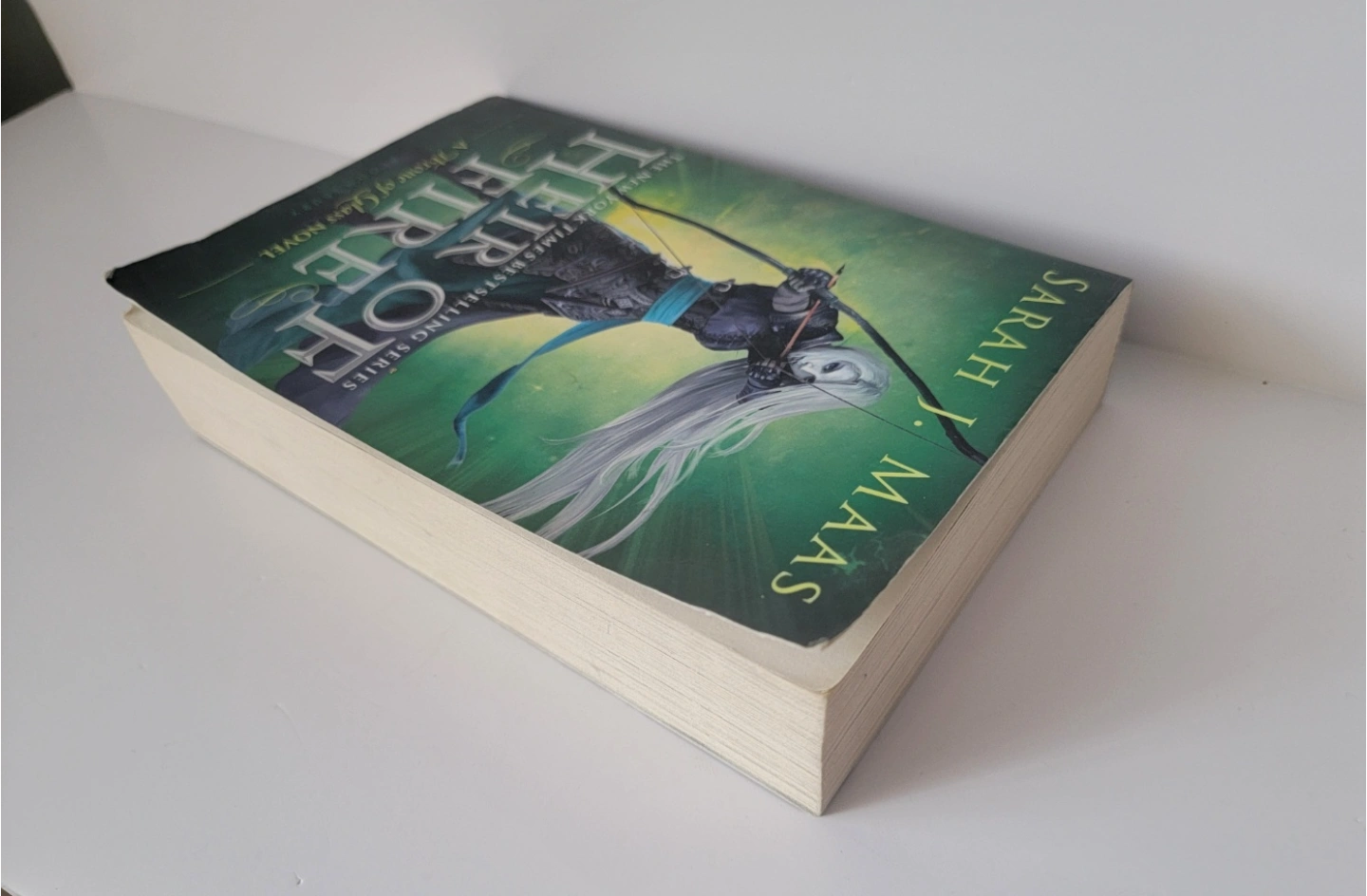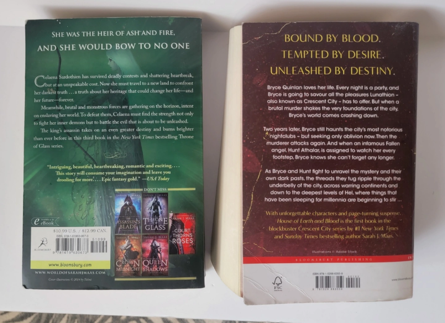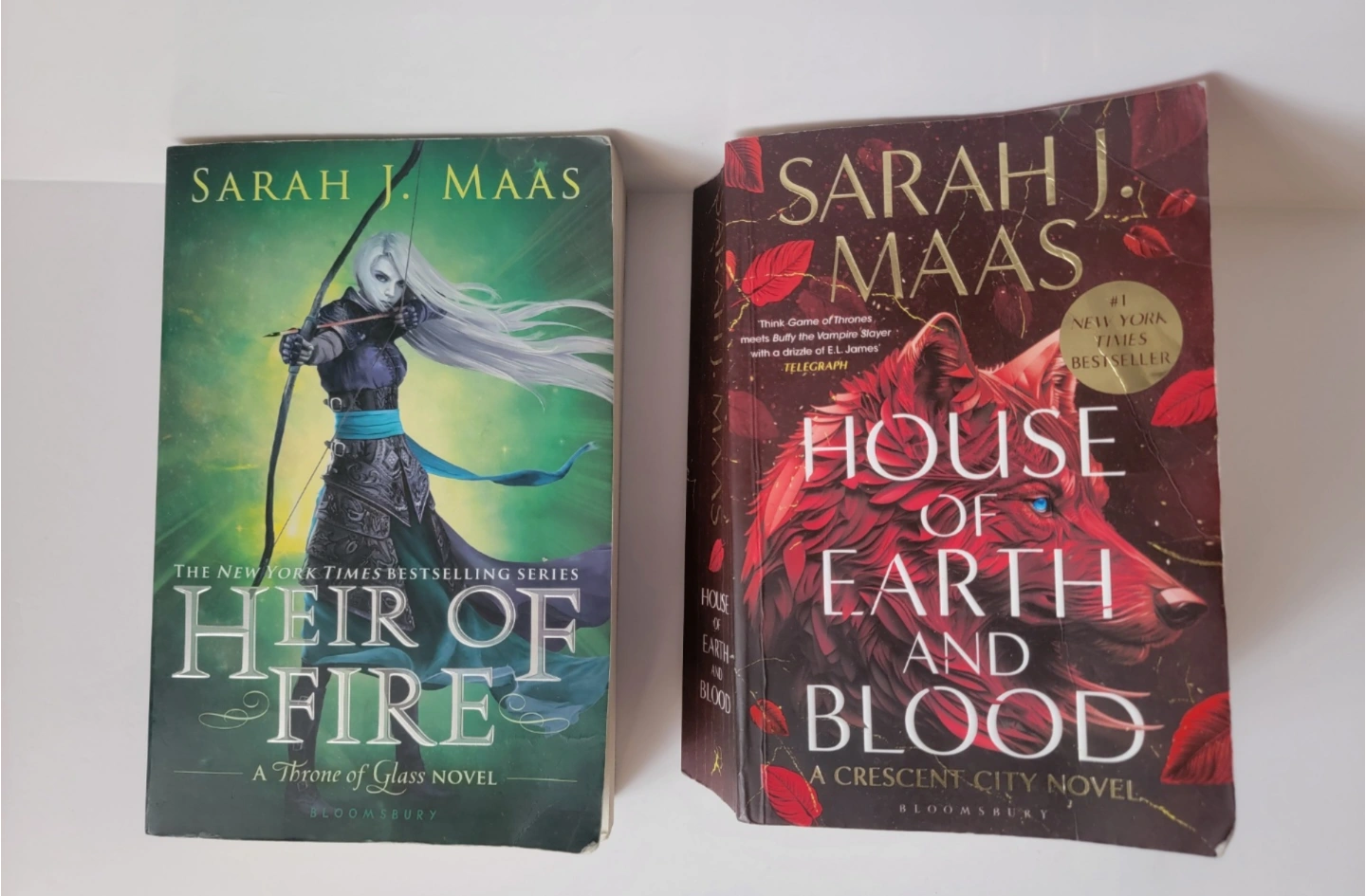 Two fantasy novels by Sarah J. Maas. Heir of Fire, a Throne of Glass novel. House of Earth and Blood, a Crescent City novel. Paperback books, Bloomsbury Publishing.