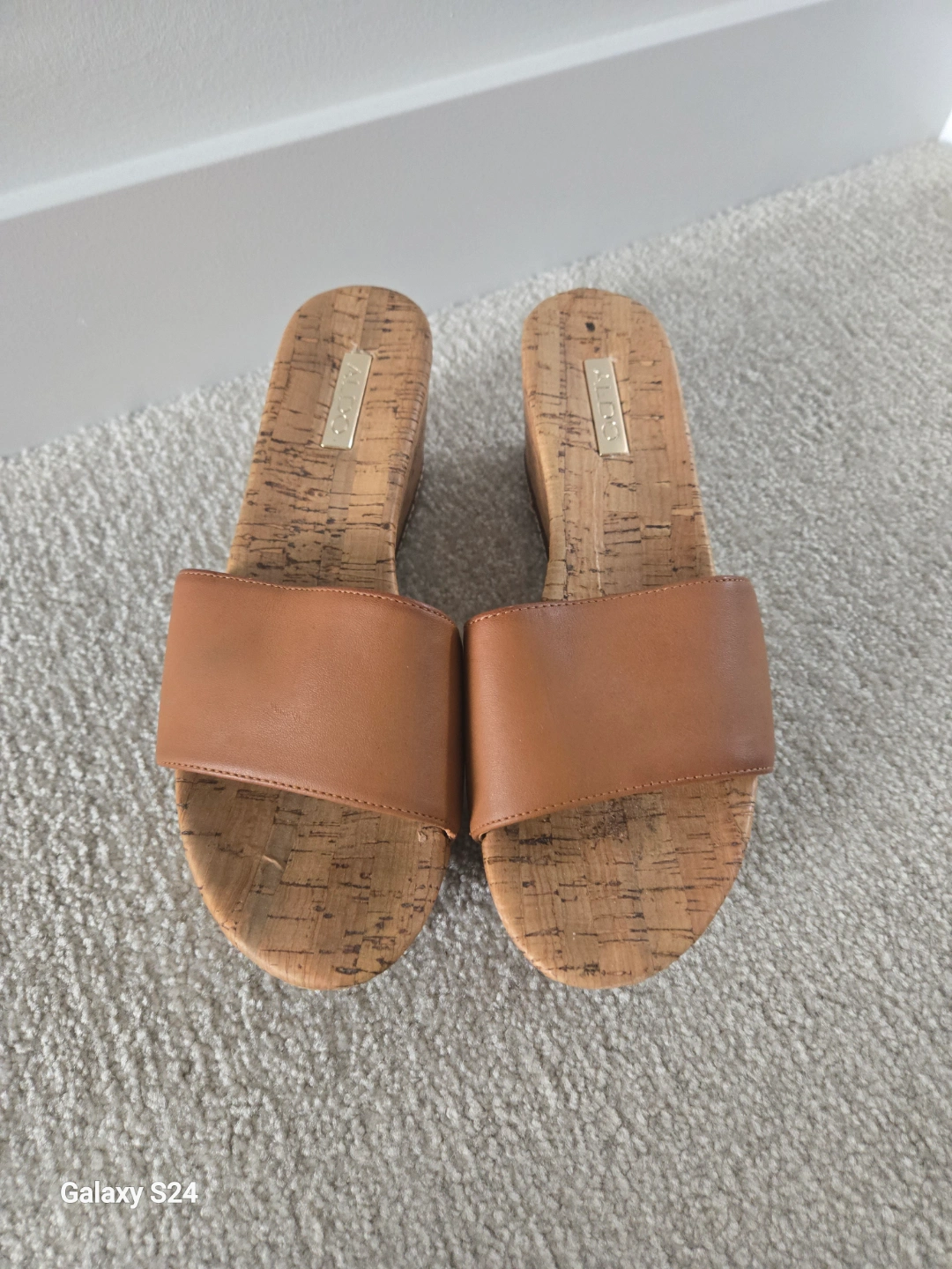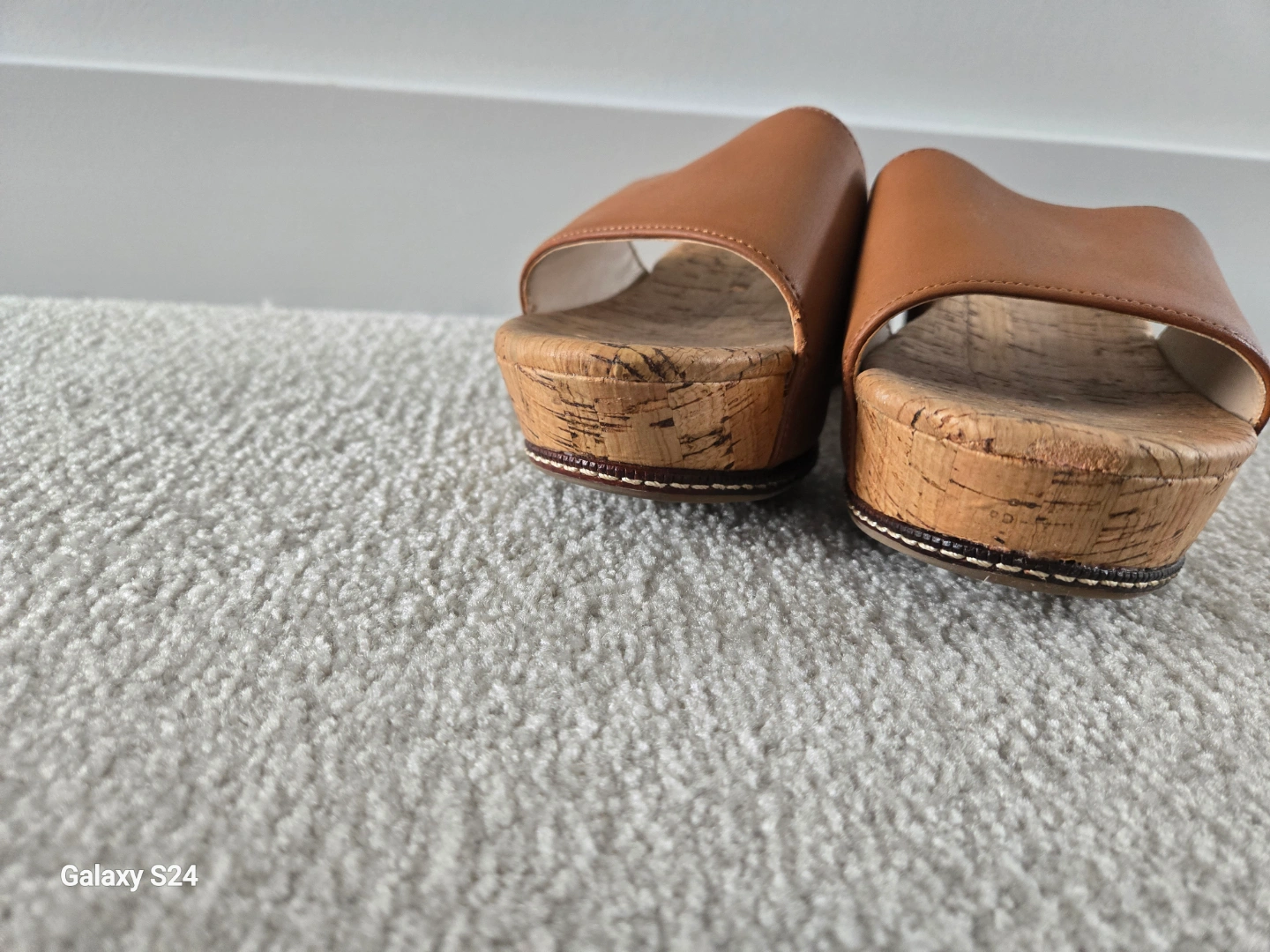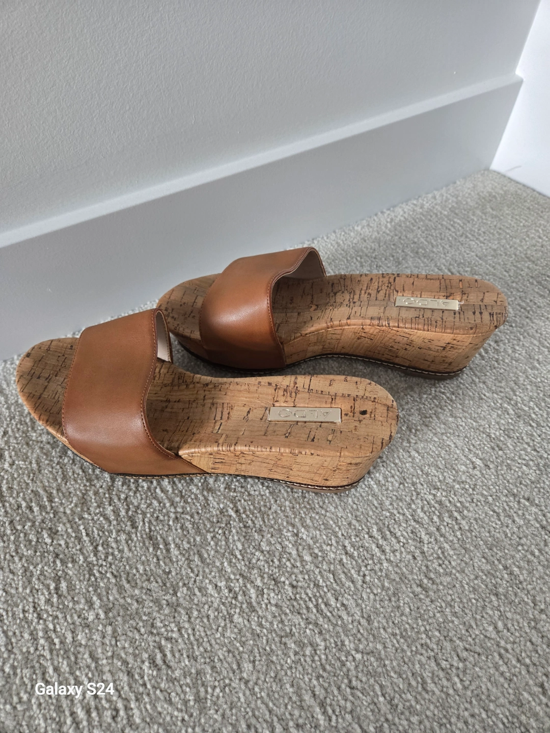 19Gorgeouse tan leather slides. Cork wedge heels great for any occasion. Great for summer. Excellent condition