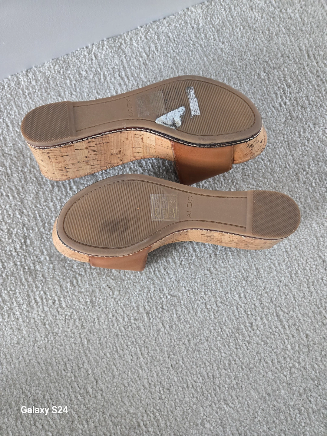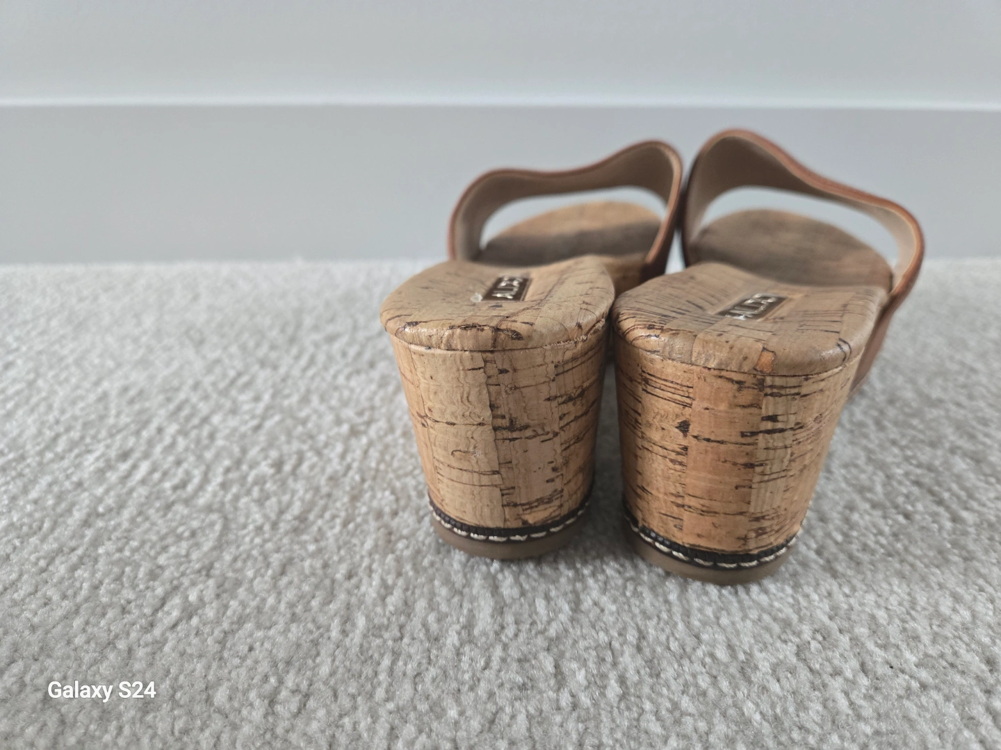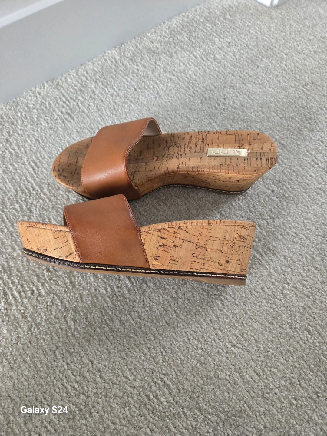 19Gorgeouse tan leather slides. Cork wedge heels great for any occasion. Great for summer. Excellent condition