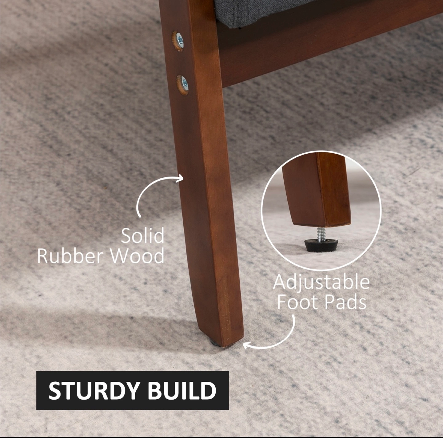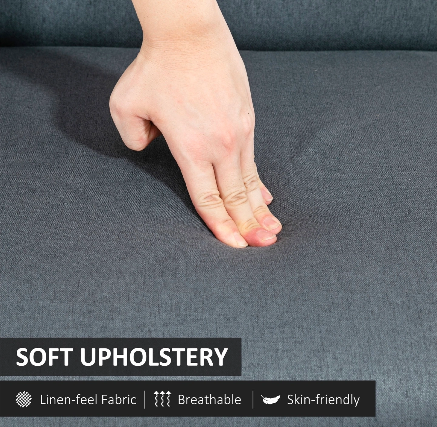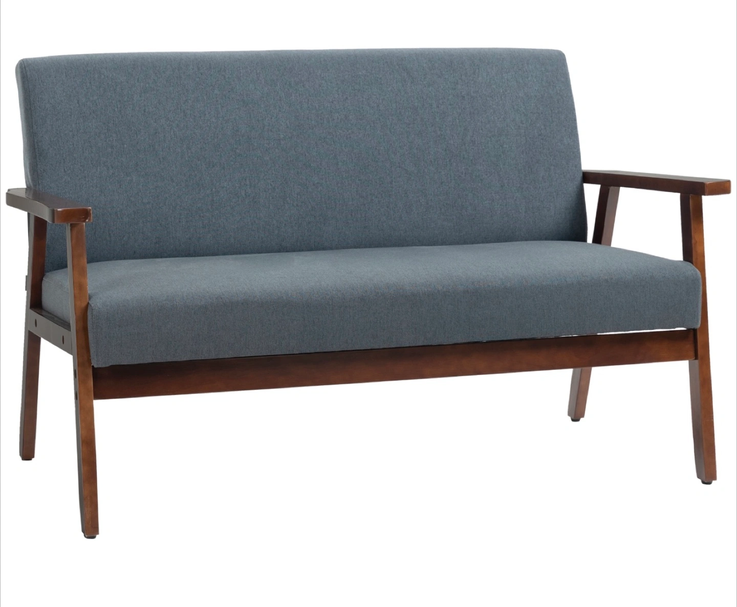 (Brand: Homcom )Stylish loveseat, grey linen-feel fabric. Dark brown wood frame and legs. Comfortable seating. Sturdy build with adjustable foot pads.