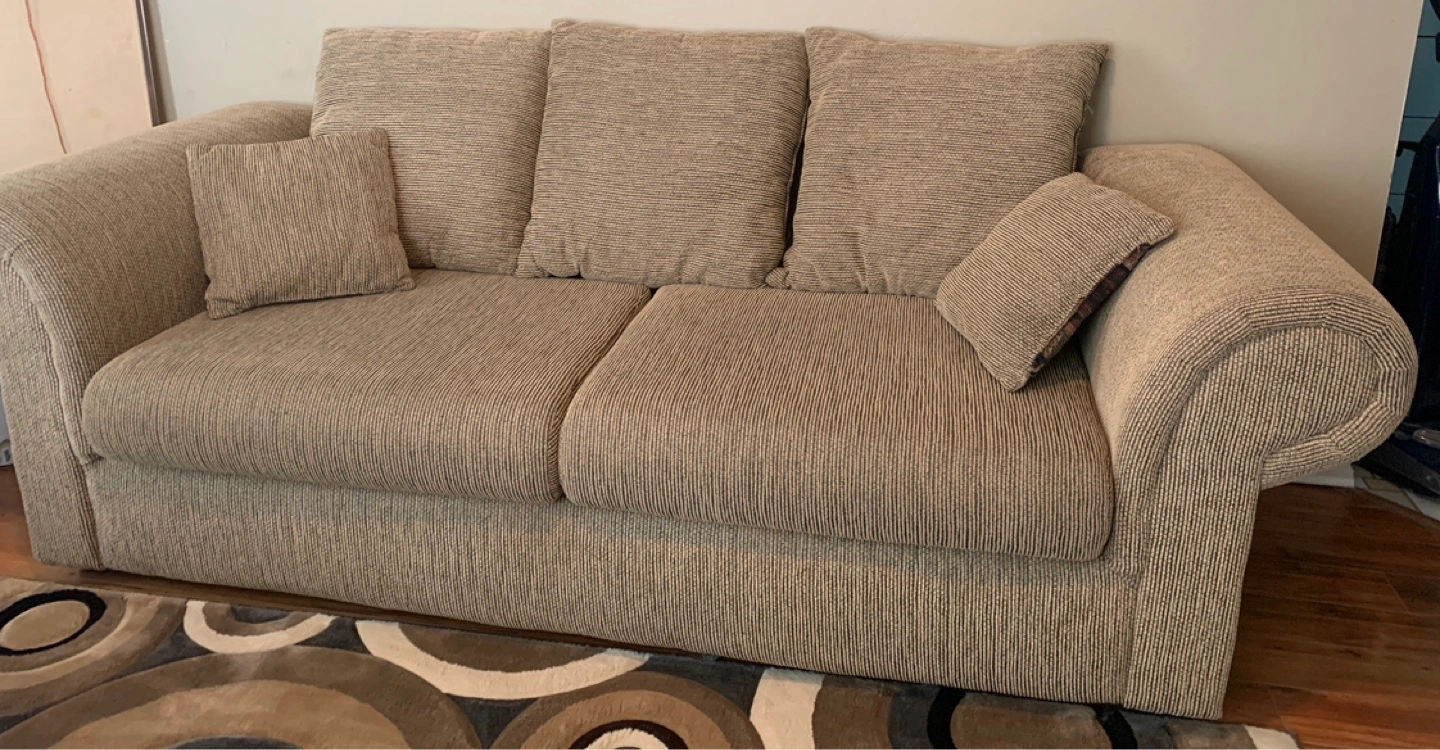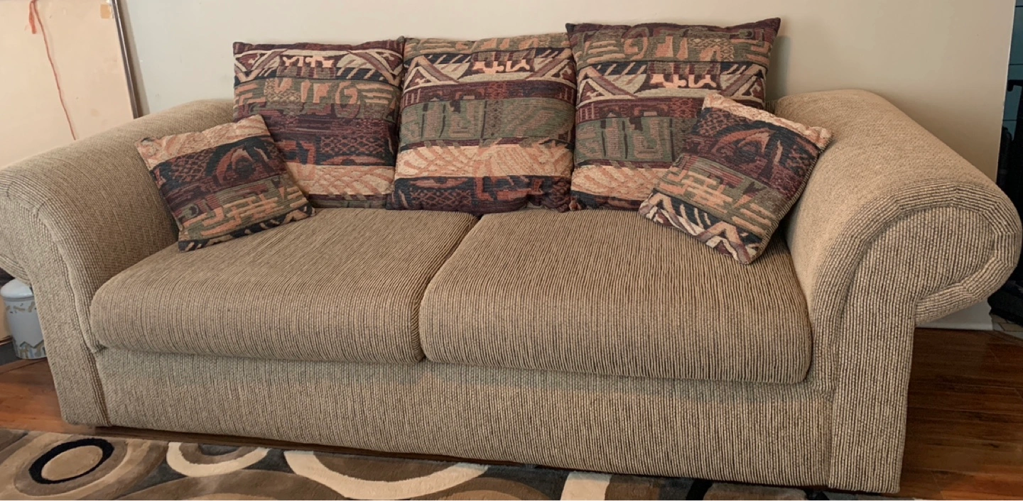 Beige couch, comfortably fits 3 easily. Features rolled arms and a neutral striped fabric. Includes five coordinating throw pillows with southwestern-inspired patterns. Good condition.