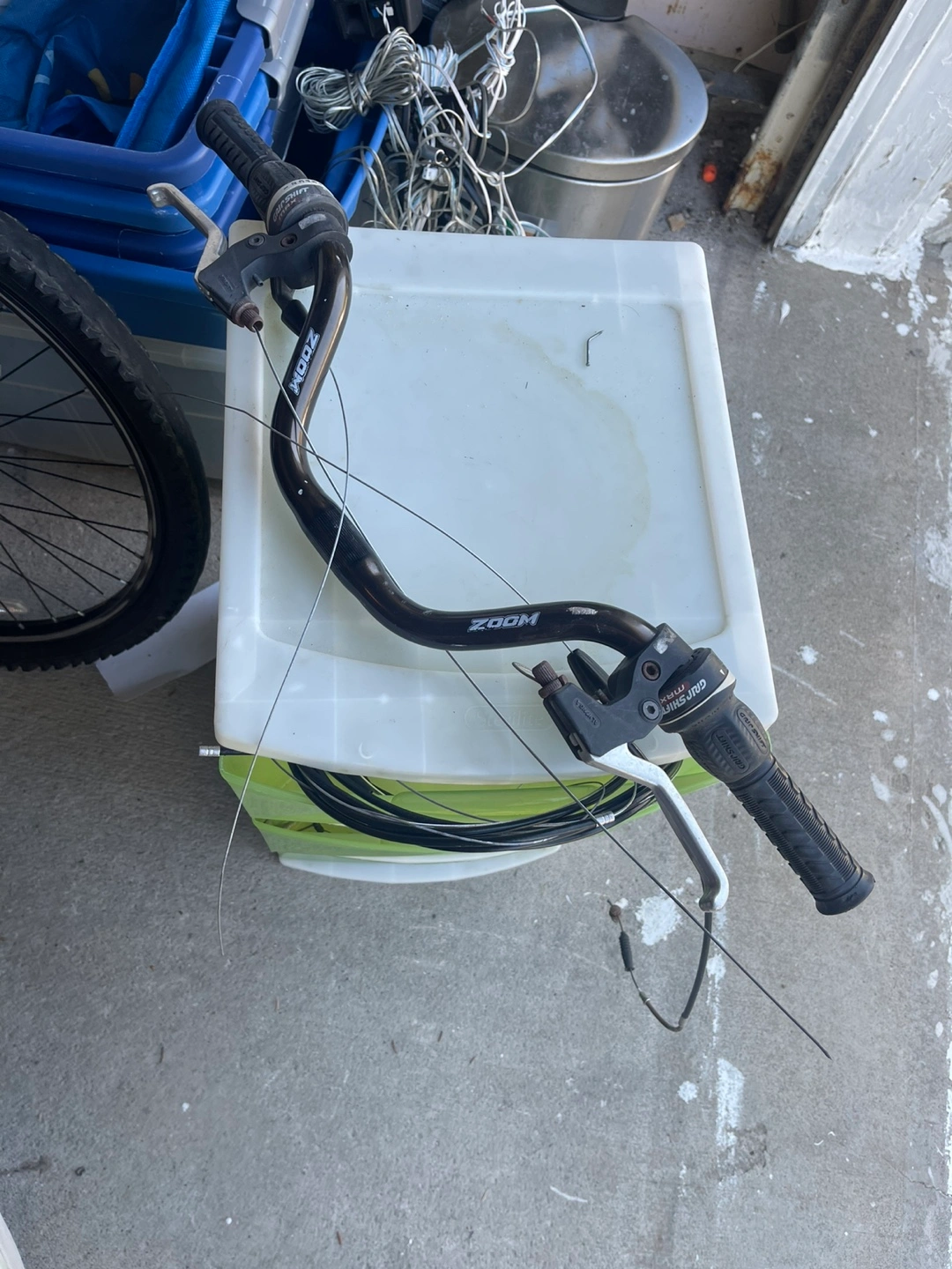 Large lot of assorted bicycle parts. Includes brake levers, shifters, cables, and more. Some parts appear to be Shimano and Zoom brand. Great for repairs or projects. Sold as is.