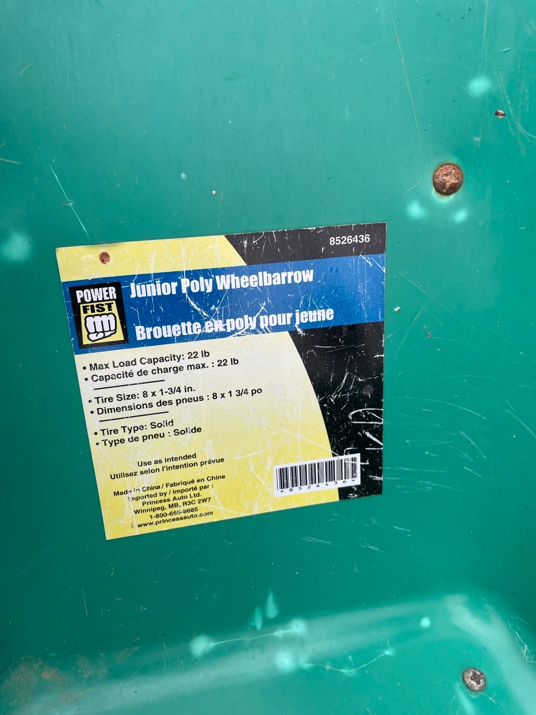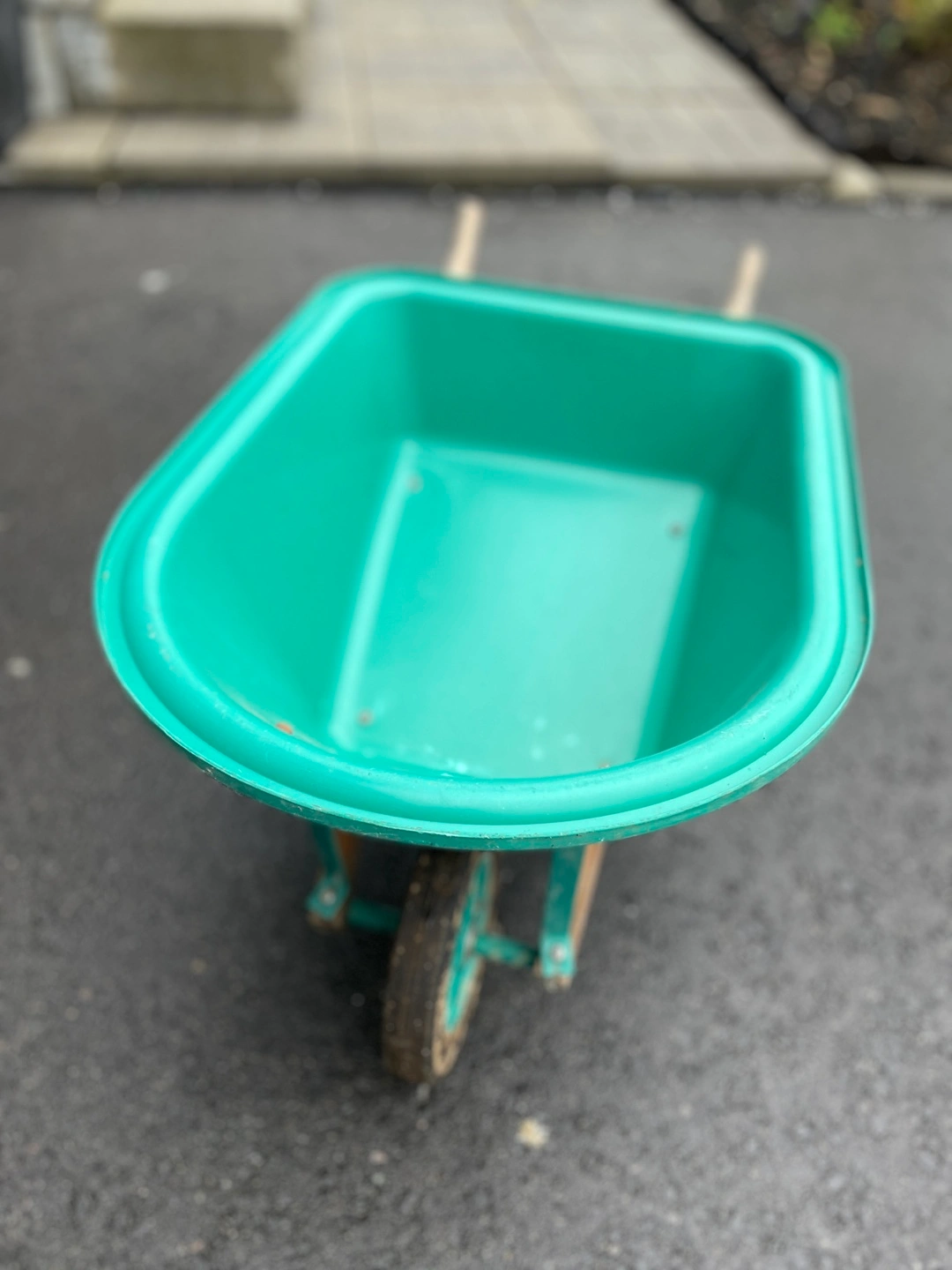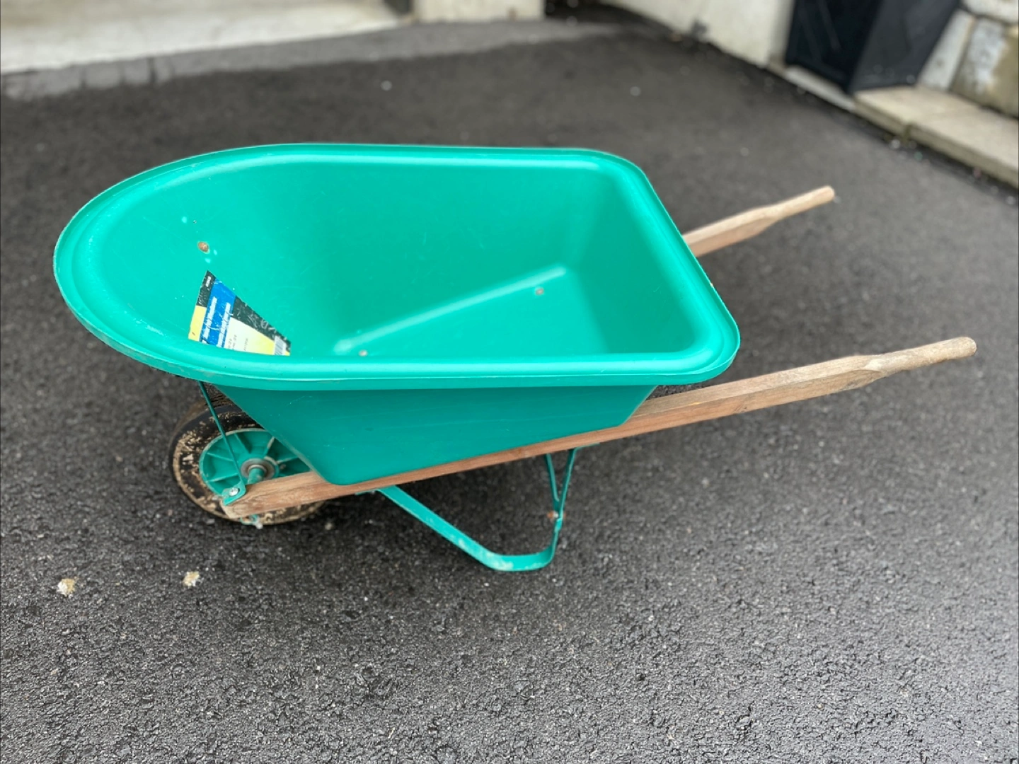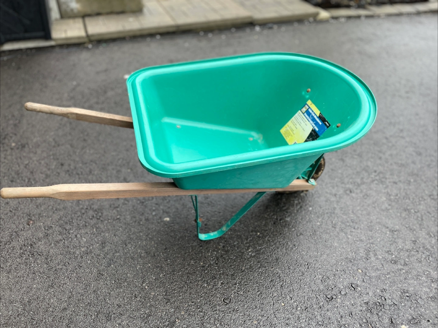 42Green plastic wheelbarrow. Wooden handles. Solid tire. Great for light-duty jobs around the yard.