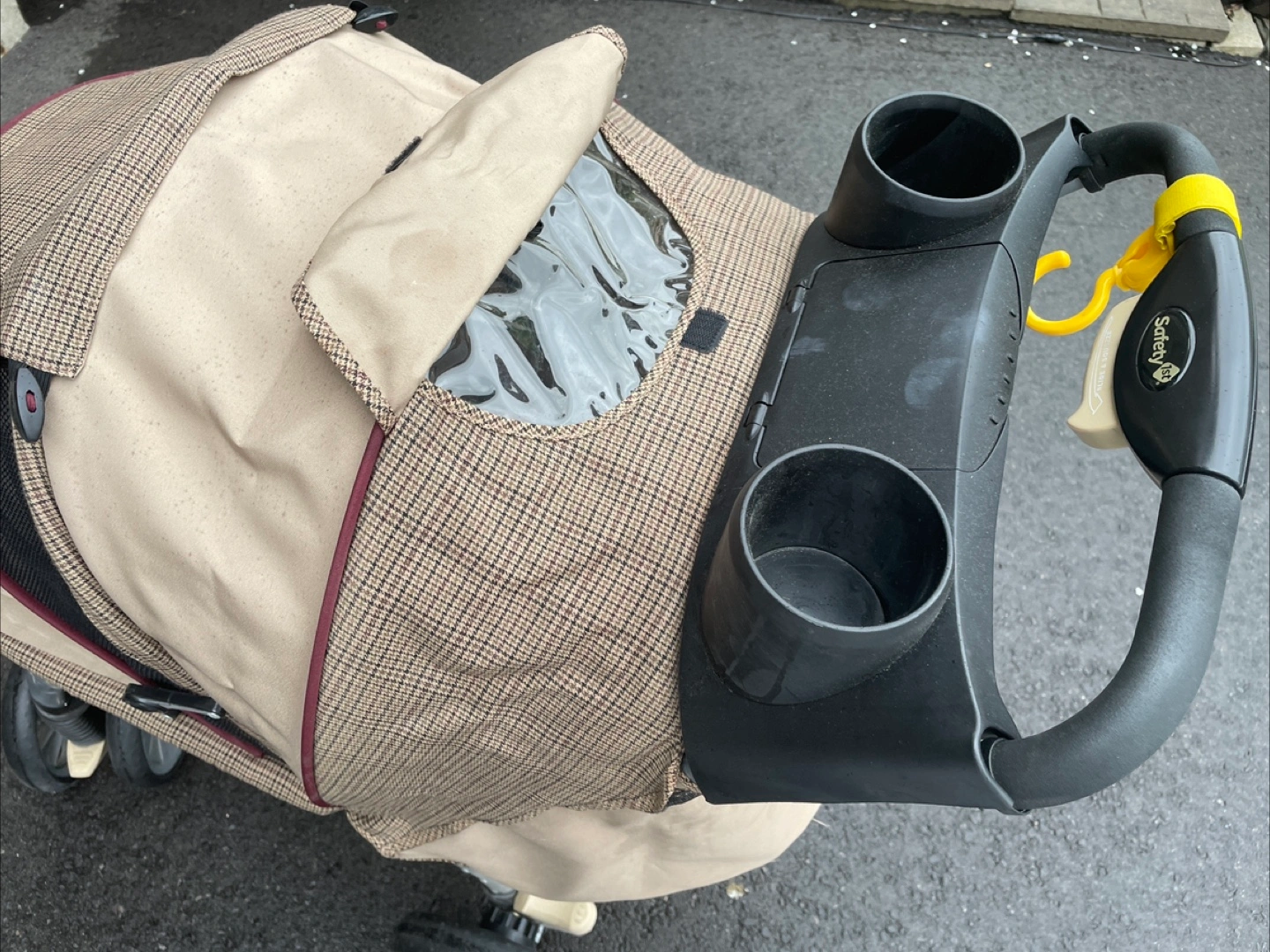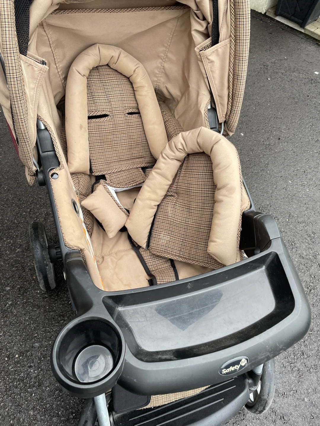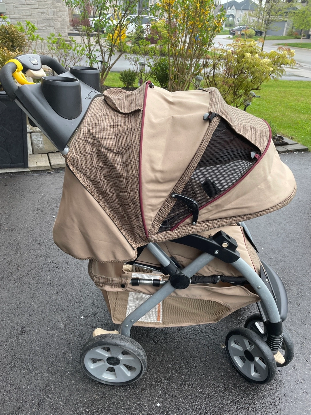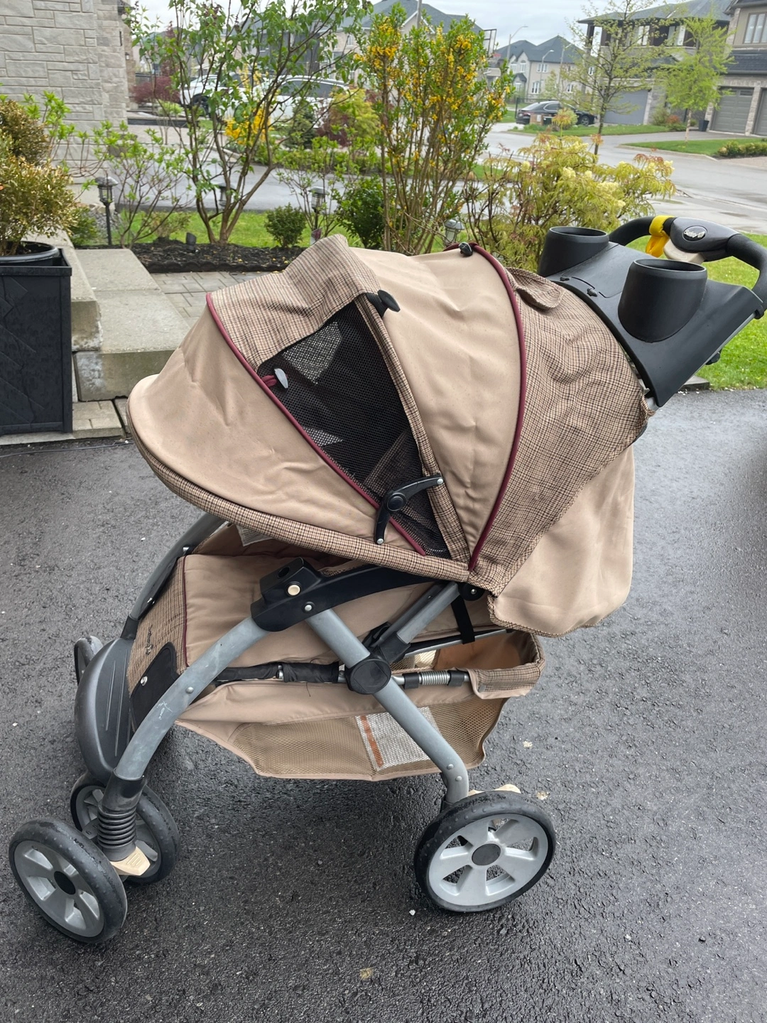 Used stroller, tan and brown plaid fabric. Features cup holders, and a peek-a-boo window. Lightweight and easy to manoeuvre. Some wear.