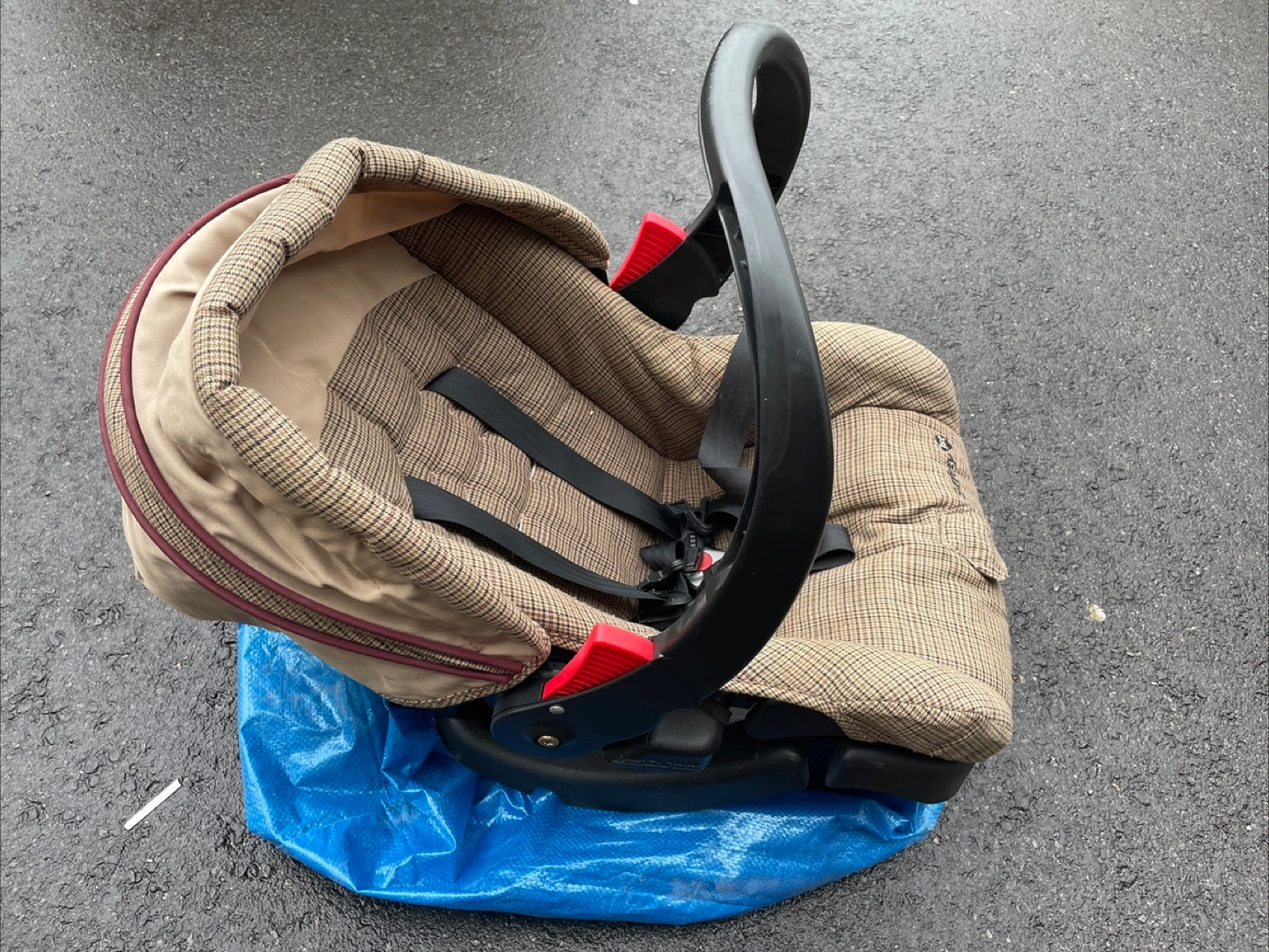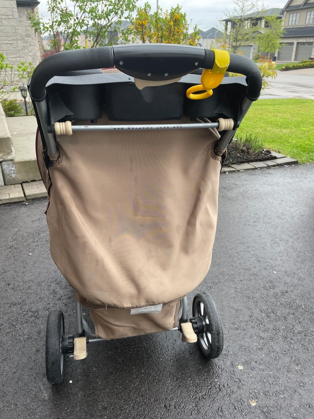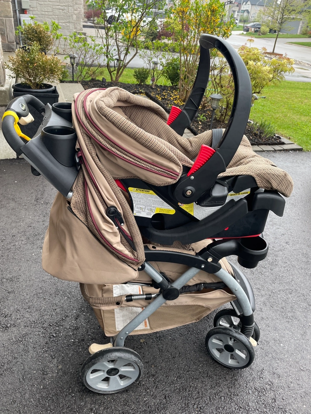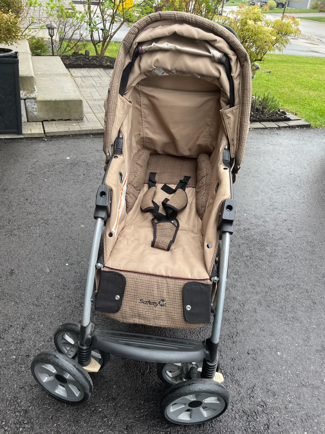 Used stroller, tan and brown plaid fabric. Features cup holders, and a peek-a-boo window. Lightweight and easy to manoeuvre. Some wear.