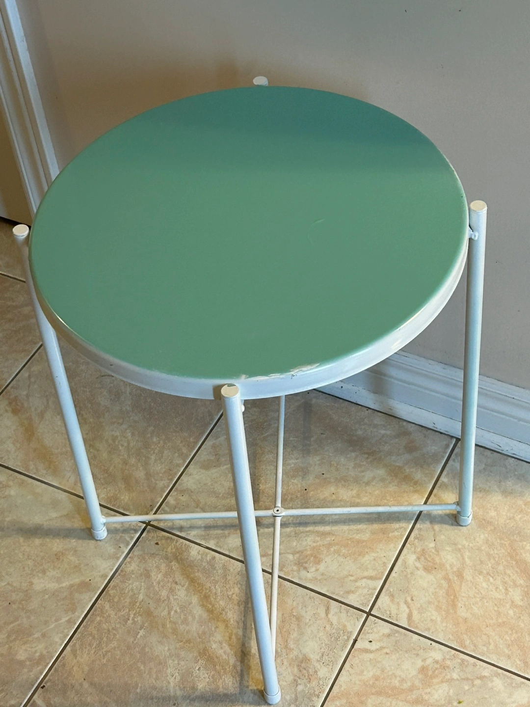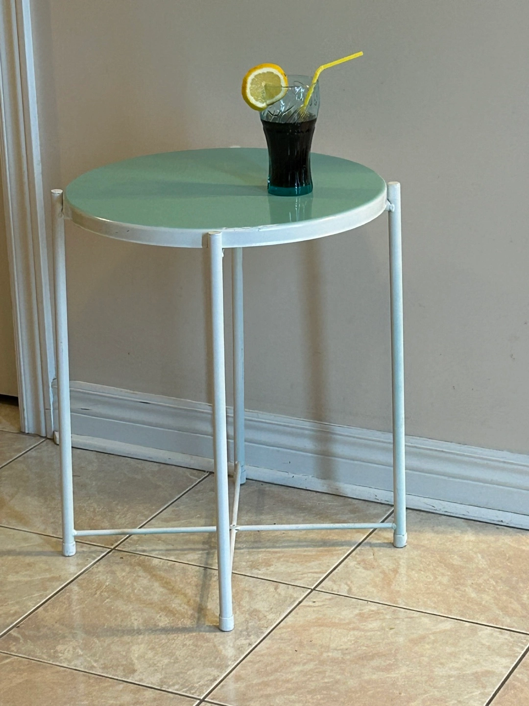Adorable little side table. White metal frame, round top. Two colours available: white and light teal. Perfect for small spaces.