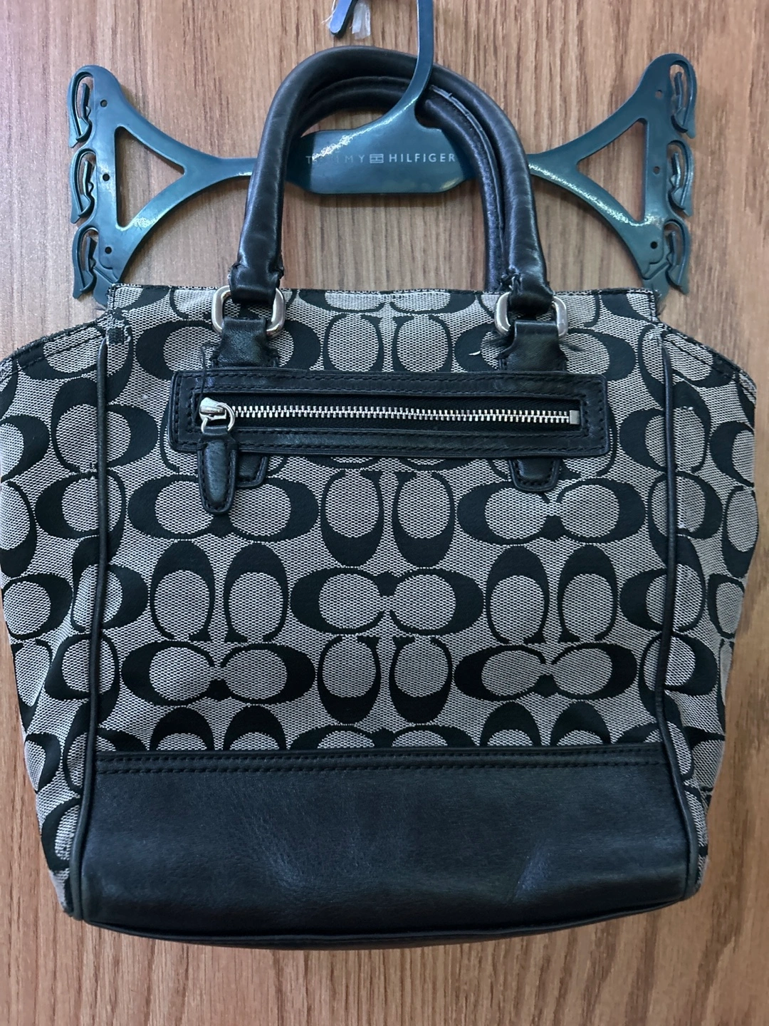 396Small black and grey Coach handbag. Features signature C pattern. Black leather trim. Top handles. Interior zip pocket. Zip closure.