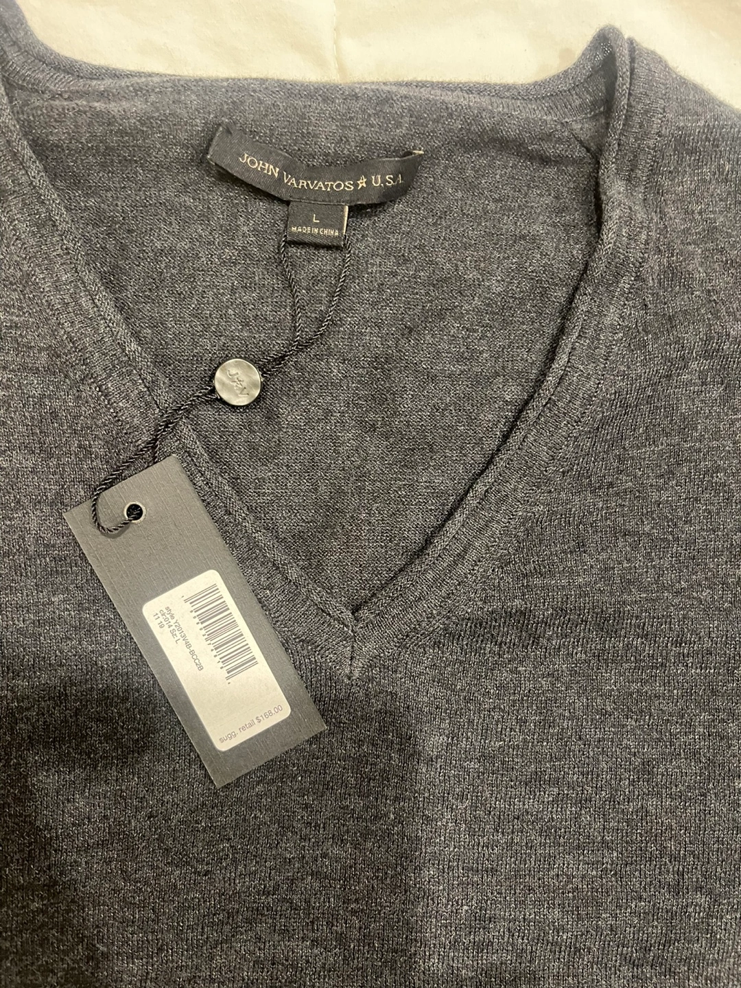 Men's charcoal grey V-neck long-sleeve sweater. Size large. New with tags. Soft material. Excellent condition.