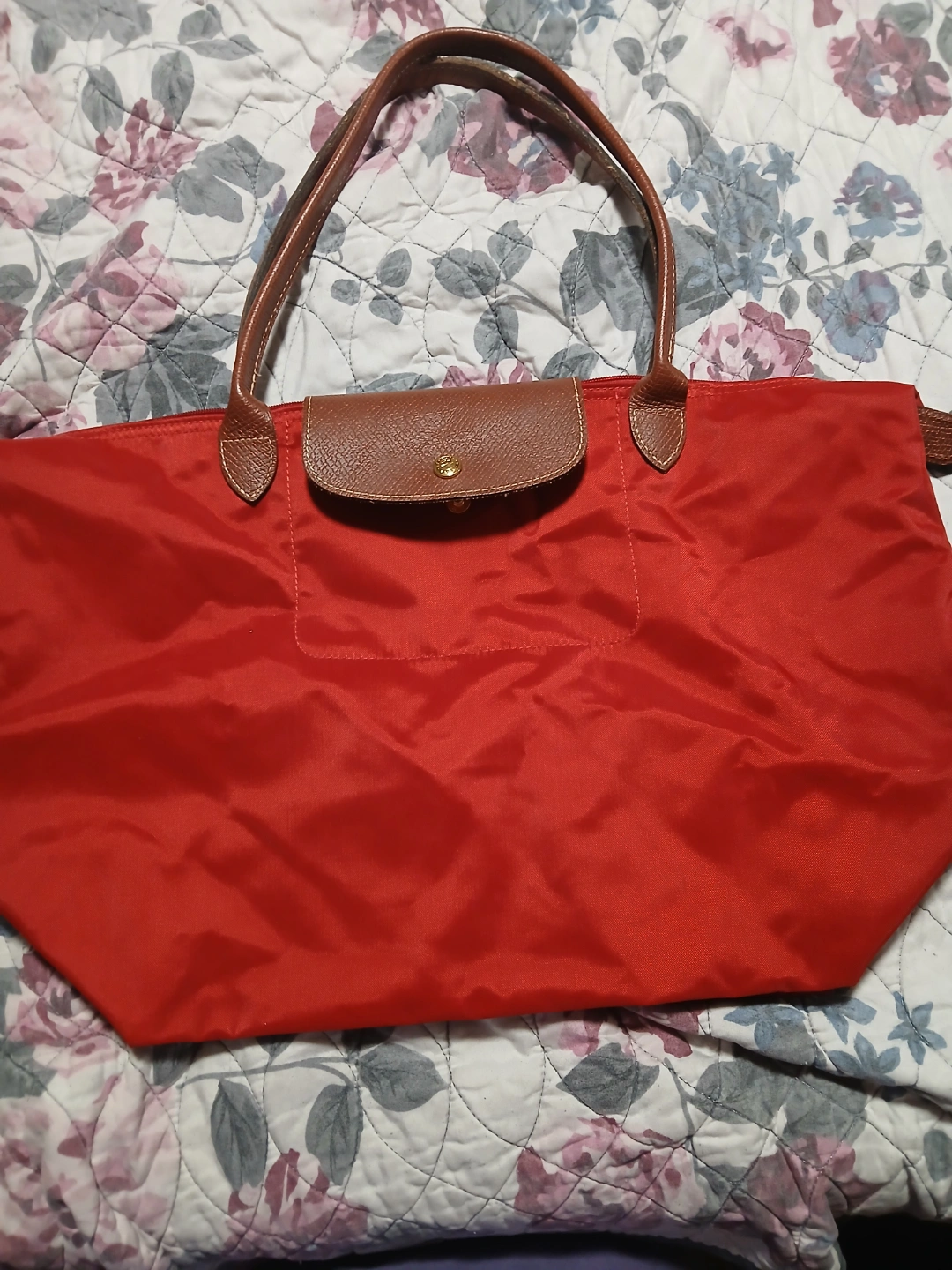 533Red Longchamp Le Pliage tote bag. Features a brown leather trim and gold hardware. Zip closure. Pre-owned. price is firm plz. pick up midland and Danforth or 401 bay street or stc mall or Kennedy or runnymede stn