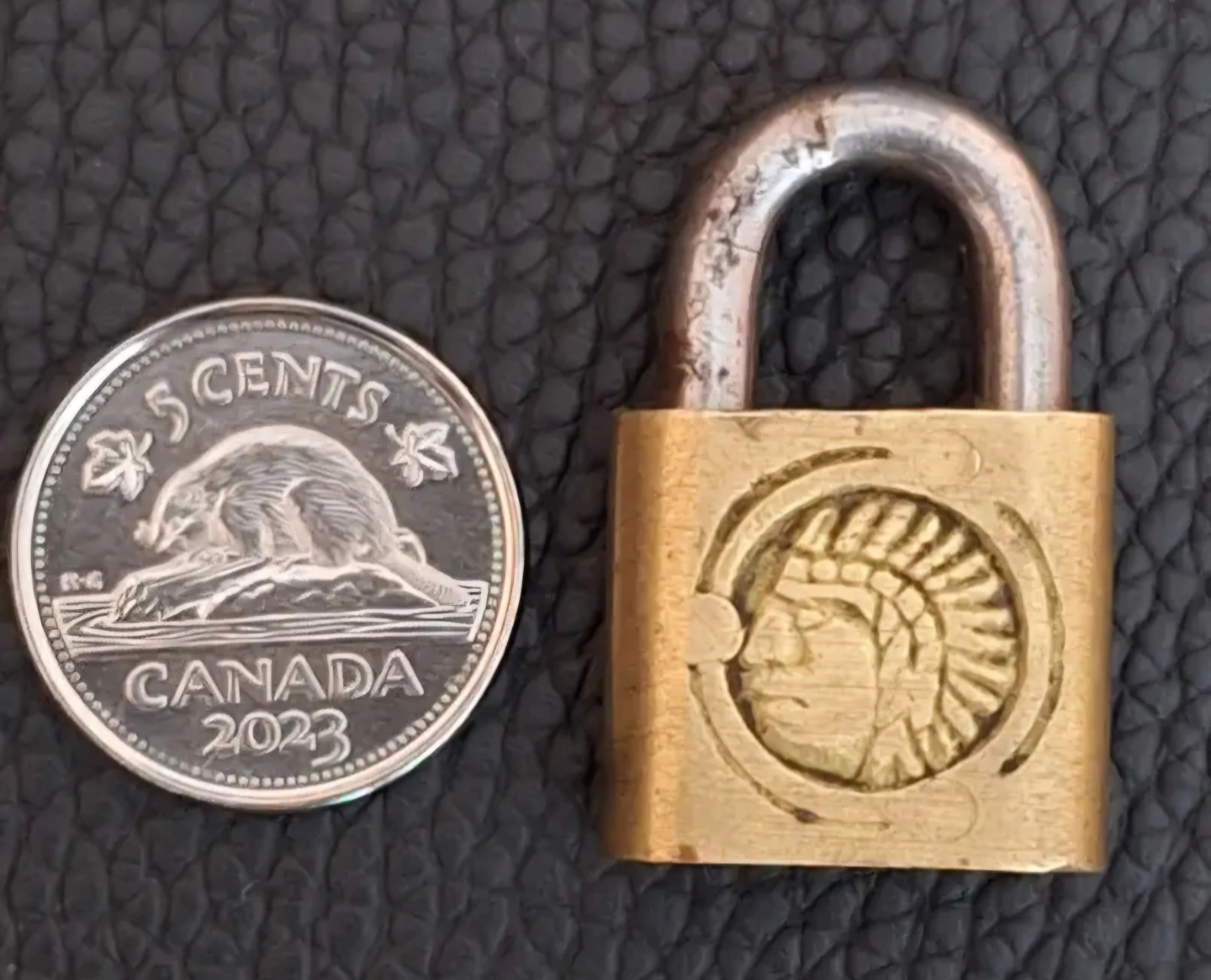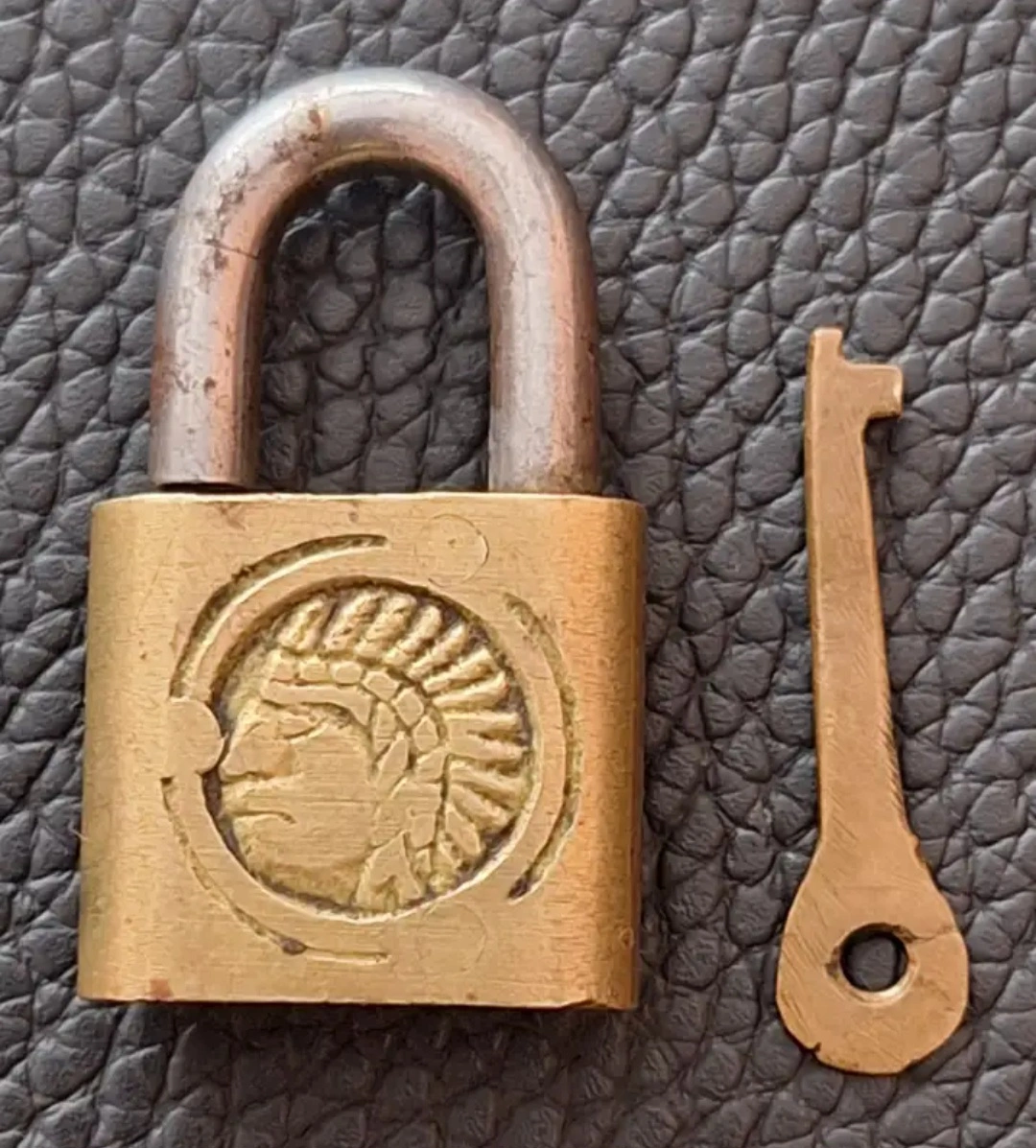 Vintage small brass padlock from 1940s. Features a unique design of a Native American chief. Includes original key and working. Made by Slaymaker. Shows some signs of age and wear.