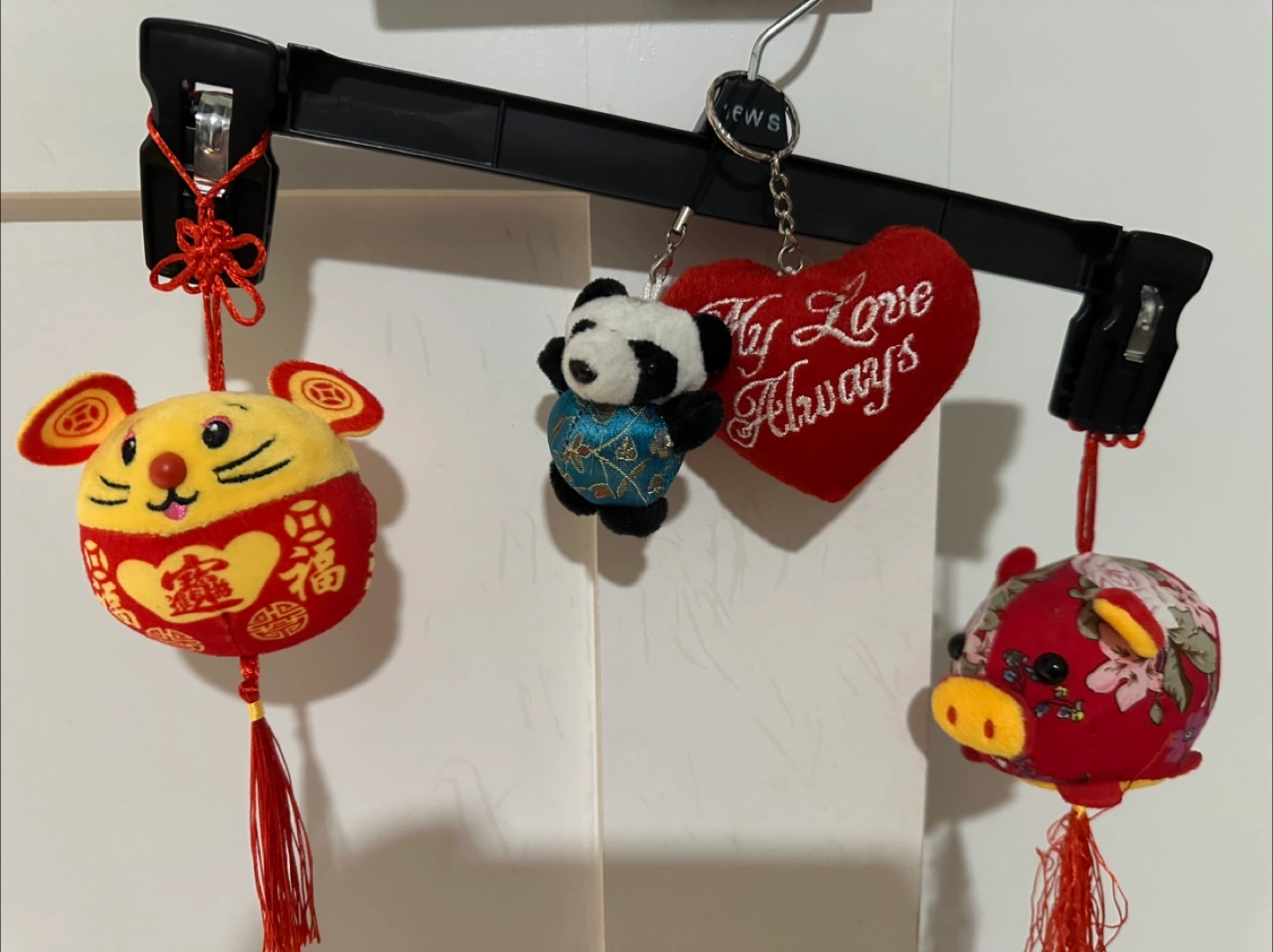 Set of four keychains. Features a mouse, panda, pig, and heart. Red and gold colors, festive and cute. Perfect for bags or as a decoration.