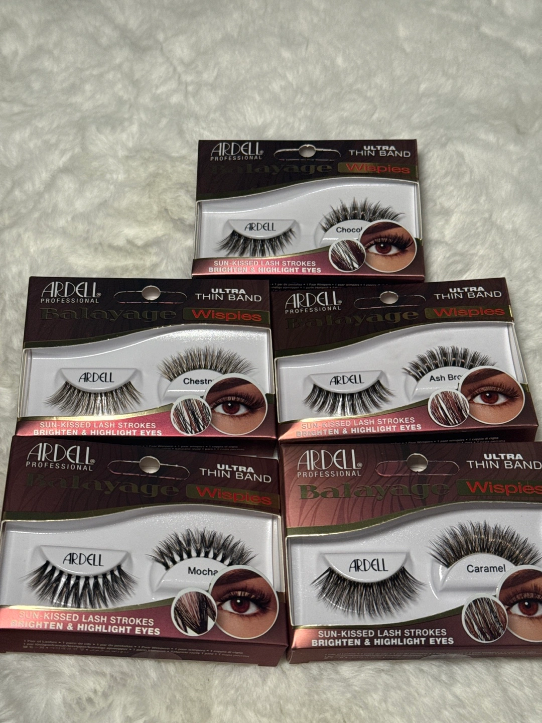 150Five pairs of Ardell Professional Balayage Wispies eyelashes. Ultra thin band. Sun-kissed lash strokes brighten and highlight eyes. Shades include Choco, Chestnut, Ash Brown, Mocha, and Caramel.