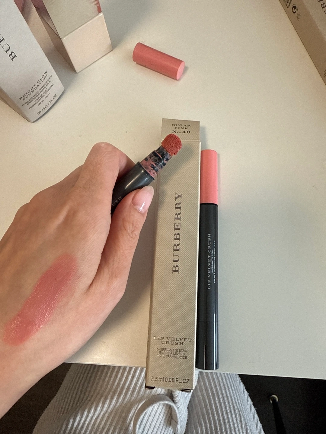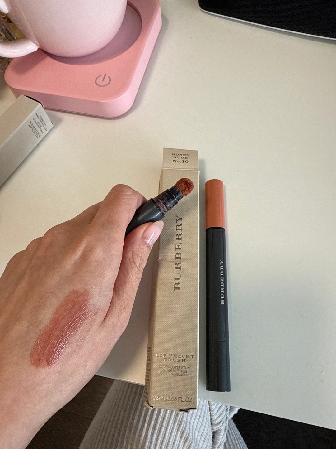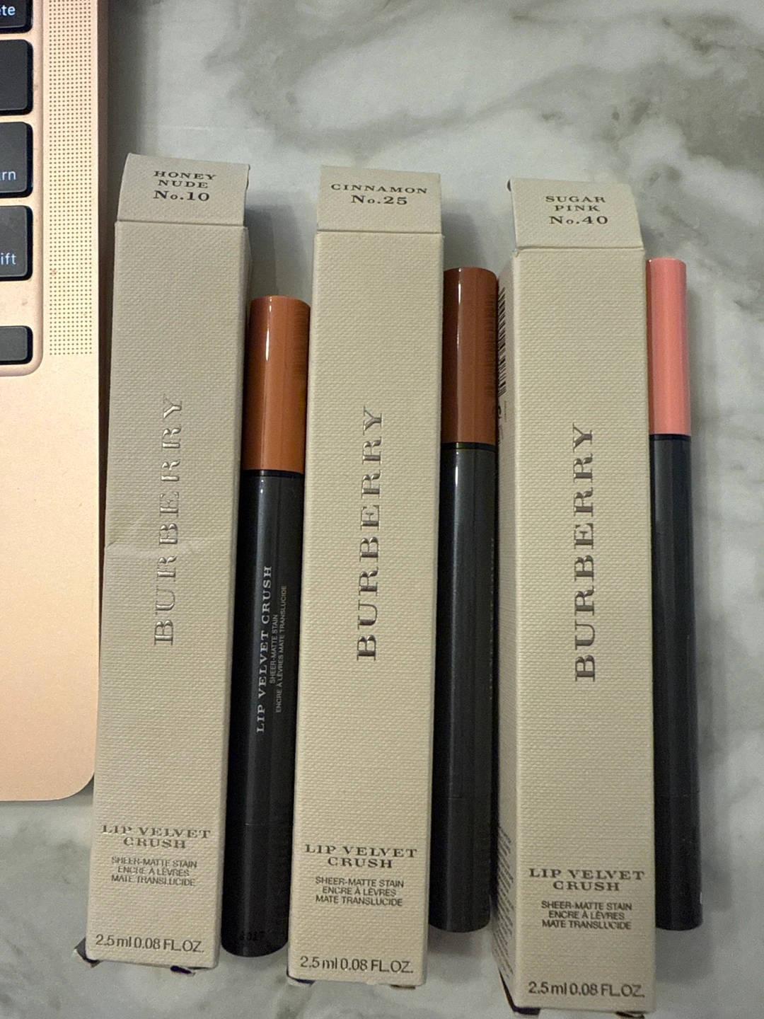 Burberry Lip Velvet Crush See picture for colour swatches. But selling products are brand new. I swatched my own for reference Left to right Honey No.10, Cinnamon No.25, Sugar No.40 Sheer matte stain New, unused. $18 each. Or take all 3 for $45