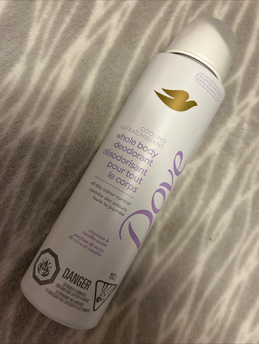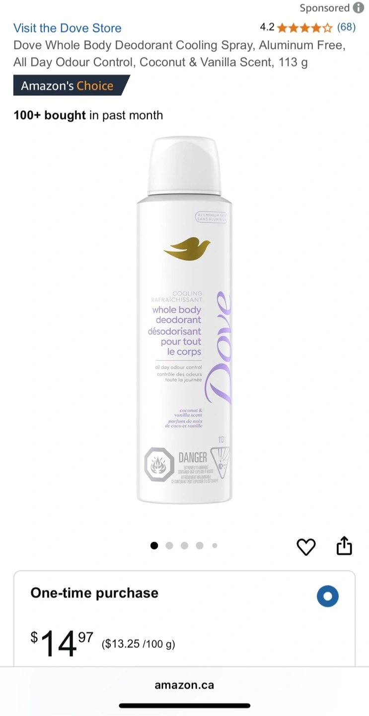 Aluminum free. 113g. Cooling spray. All day odour control. Coconut and vanilla scent. I personally do not like the smell, but I’m sure somebody else would like it. 😊
