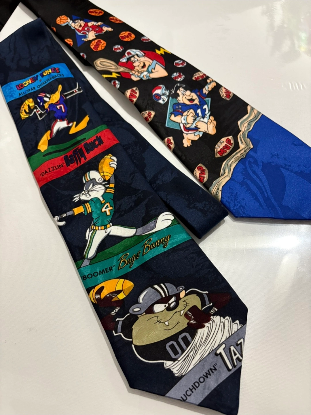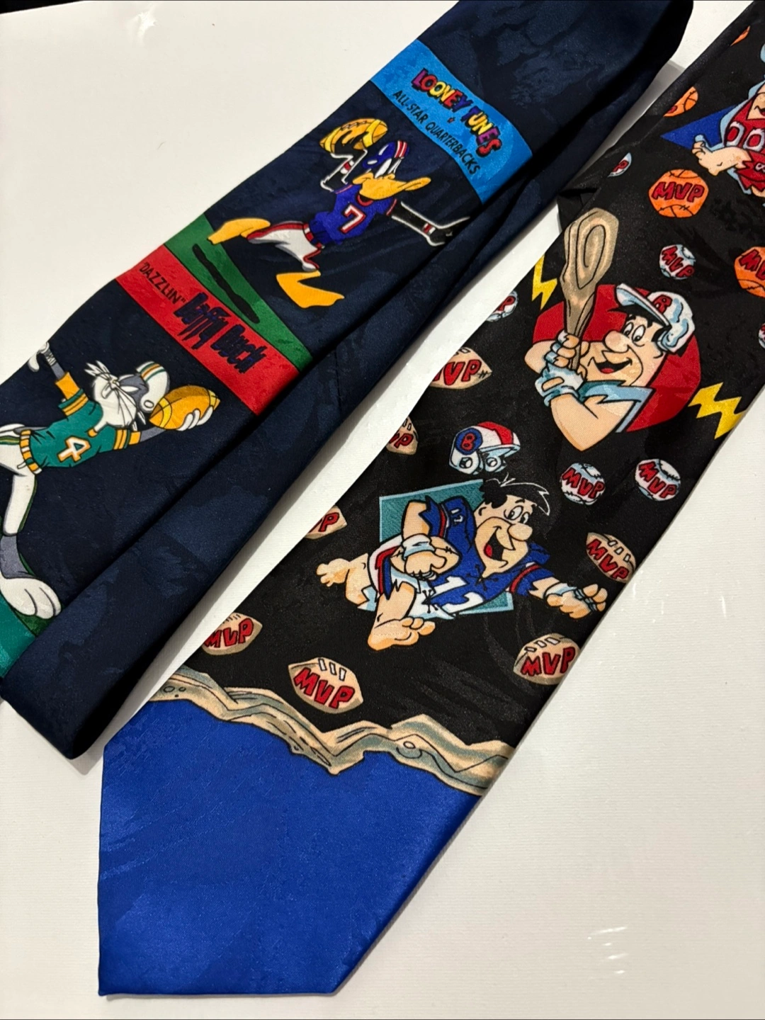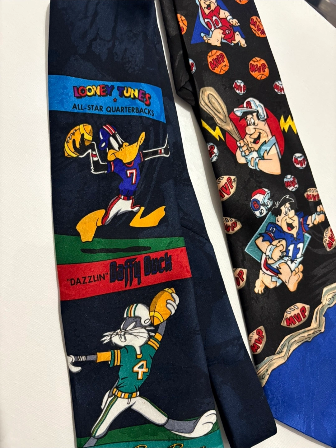 Two men's ties featuring Looney Tunes characters playing sports. One features Bugs Bunny, Daffy Duck, and Taz. The other features Fred Flintstone. Both ties are silk-like material. 1993.