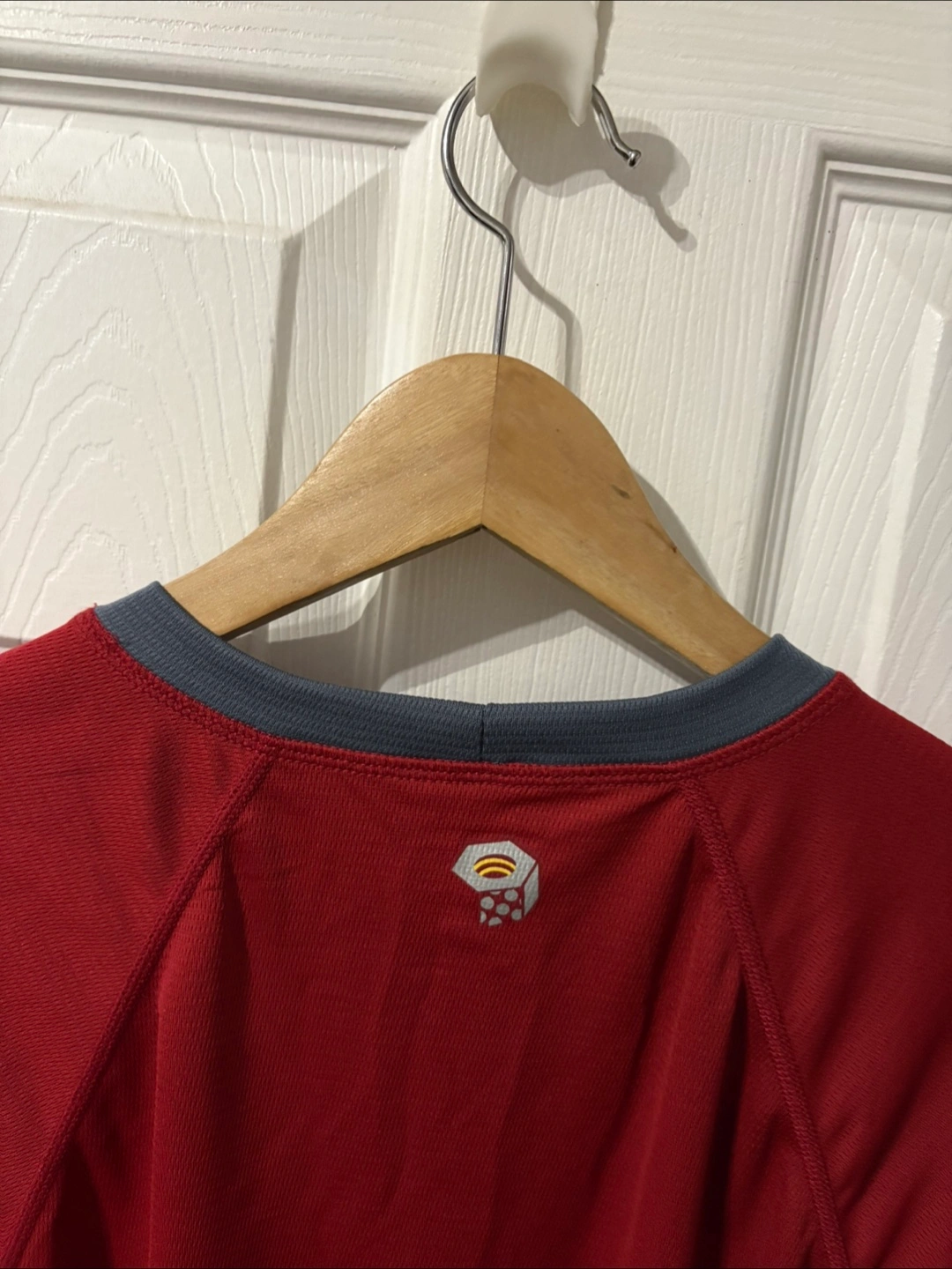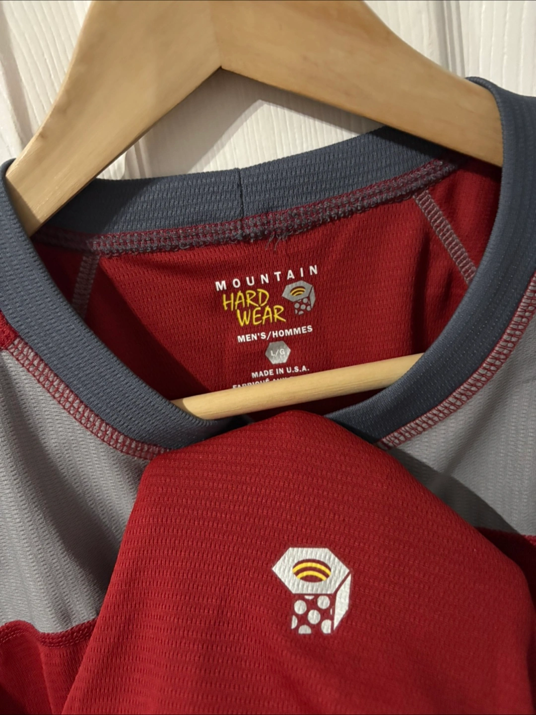 Men's short sleeve performance t-shirt. Red and grey colour block design. Made in the U.S.A. Size large.