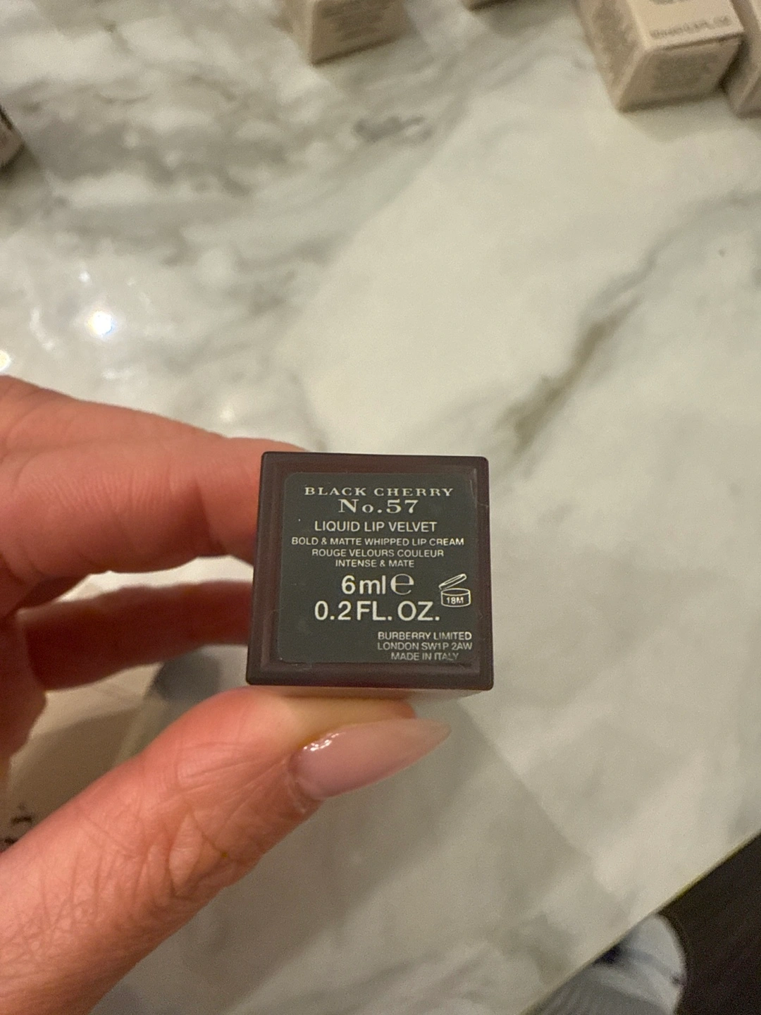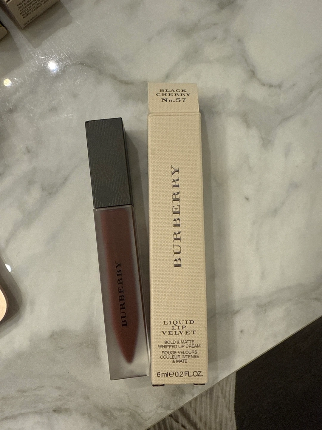 Burberry Liquid Lip Velvet in shade Black Cherry No.57. Bold and matte whipped lip cream liquid lip. 6ml/0.2 fl oz. Made in Italy.