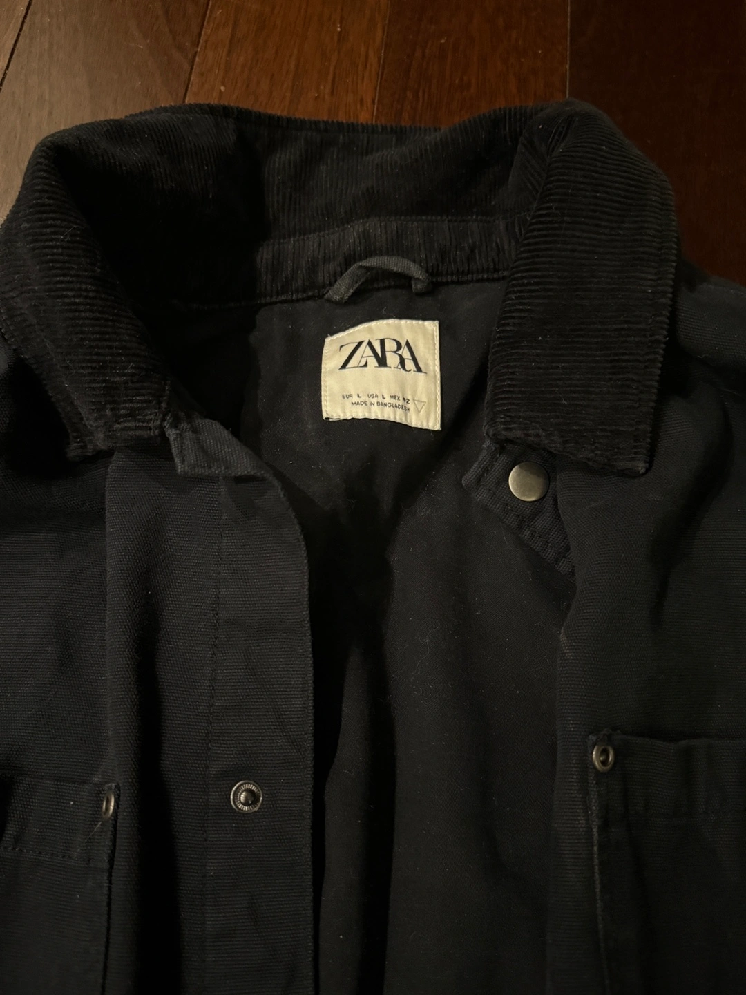 Black jacket with corduroy collar. Long sleeves, button closure. Multiple pockets. Great for fall and winter.