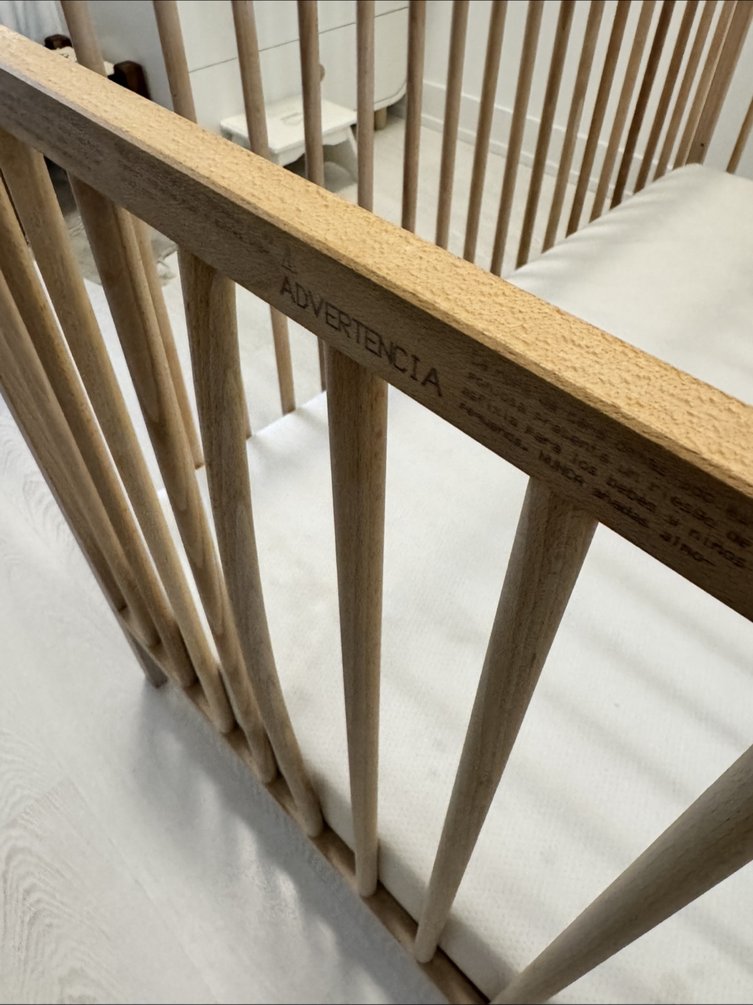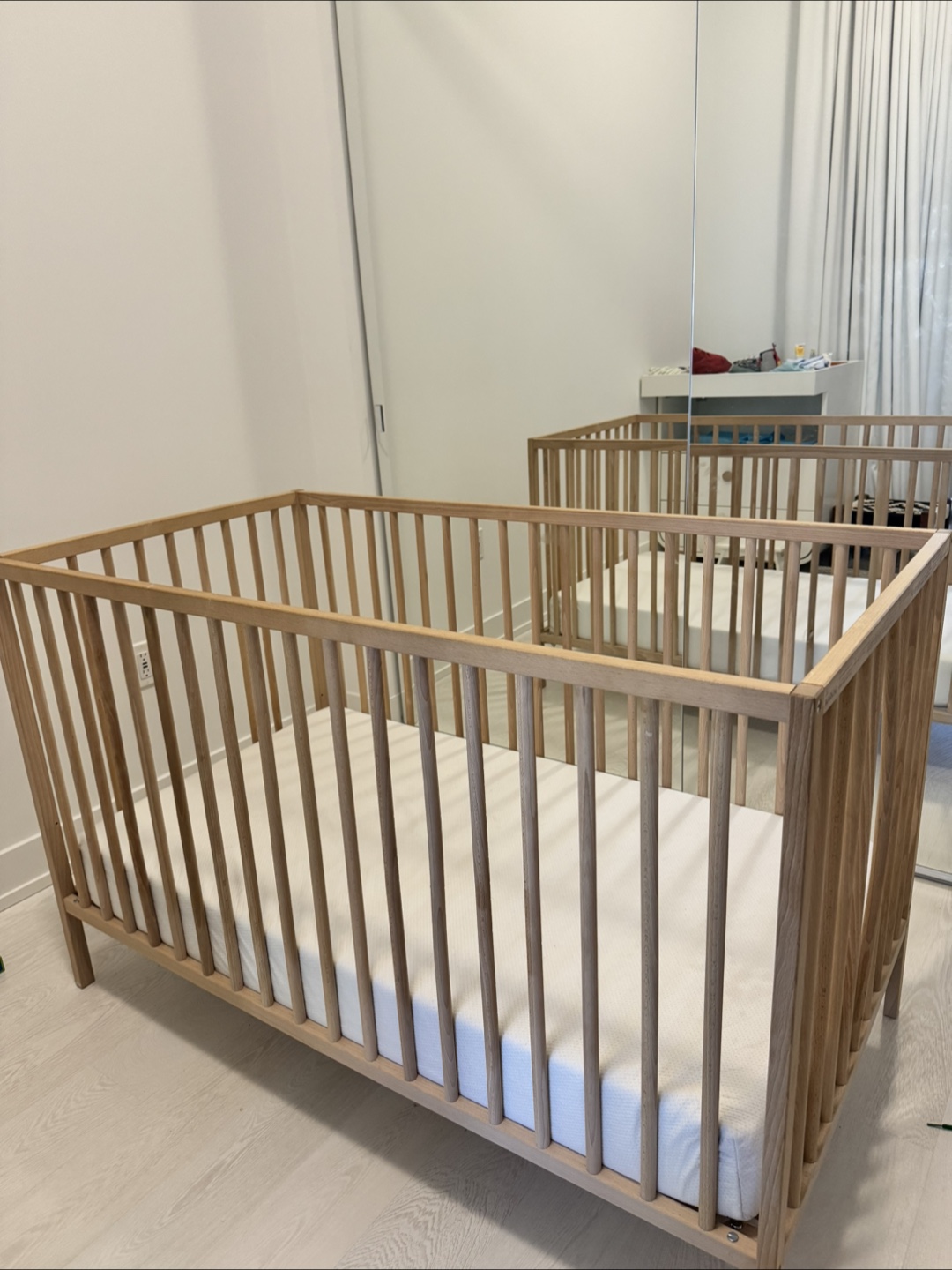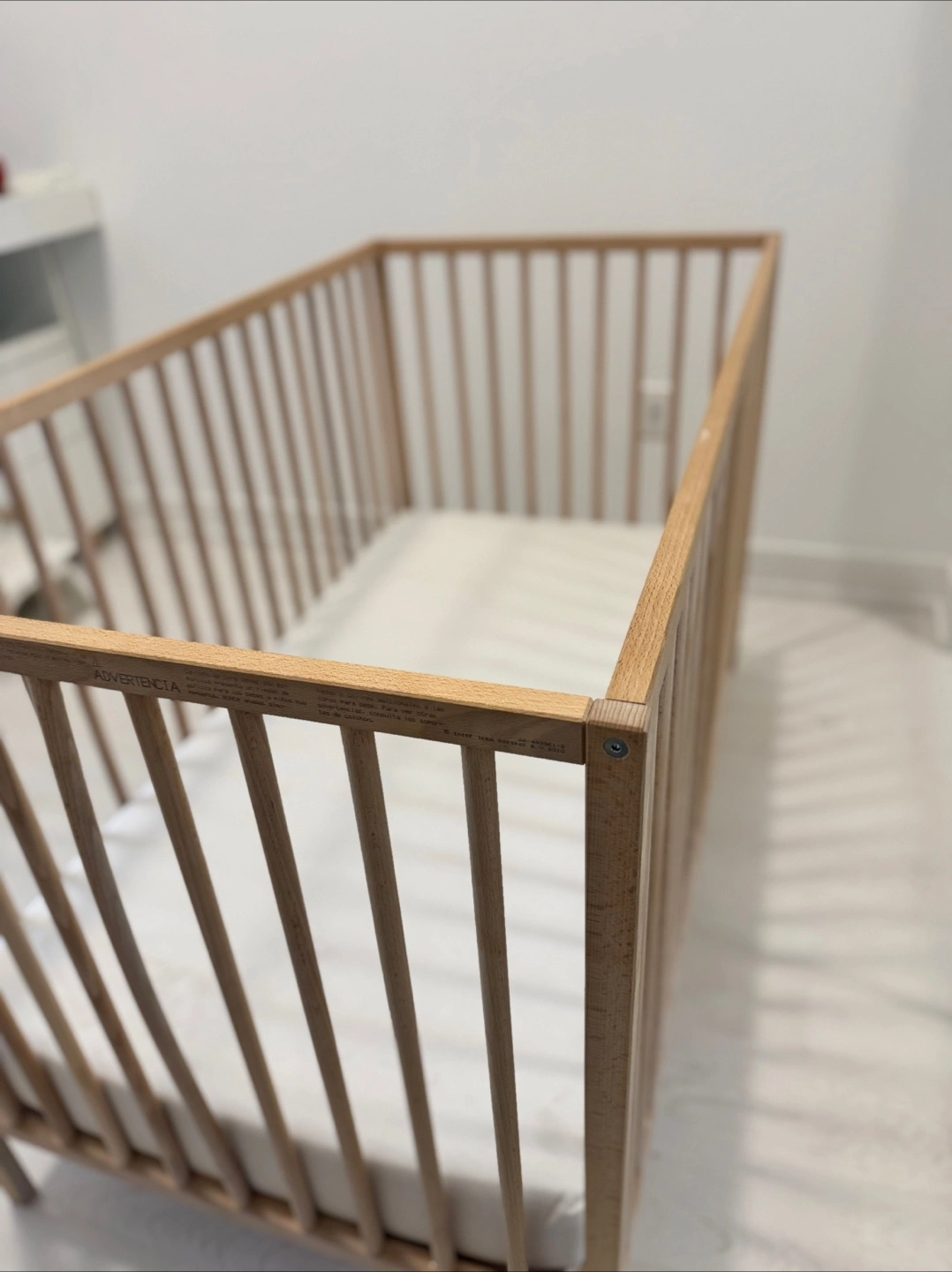Wooden baby crib. Light coloured wood finish. Simple design. Waterproof organic mattress included.