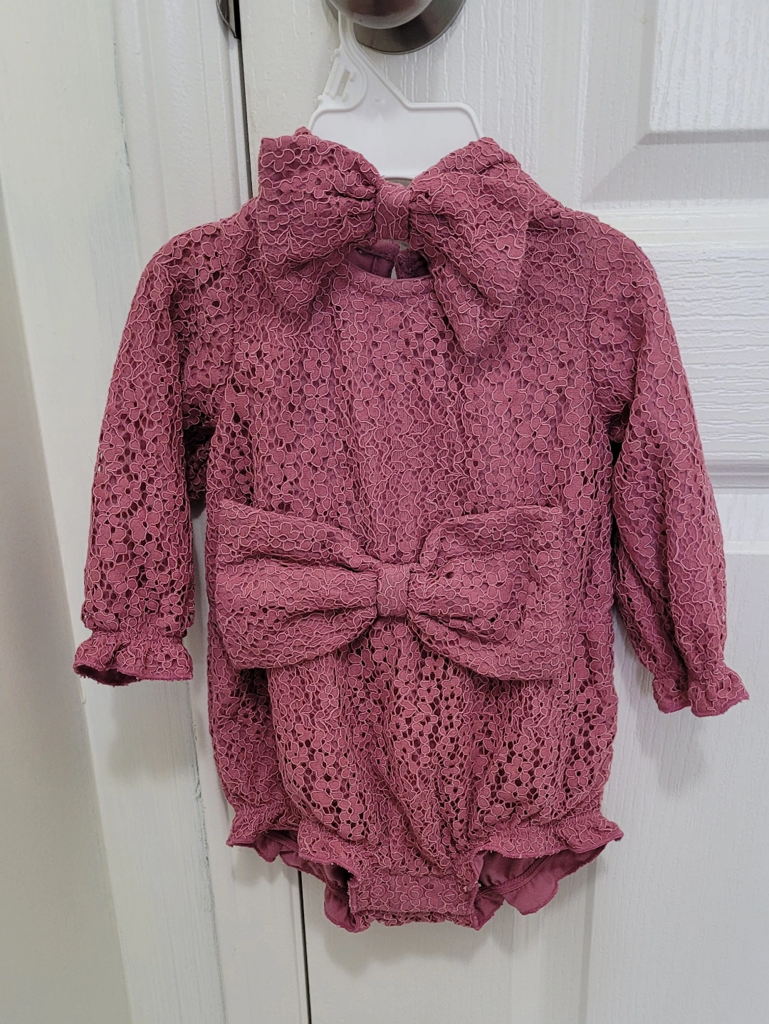 Adorable baby girl romper. Dusty rose colour. Long sleeves. Lace fabric. Features a large bow on the back. Great for special occasions.size-6 months.used only once.