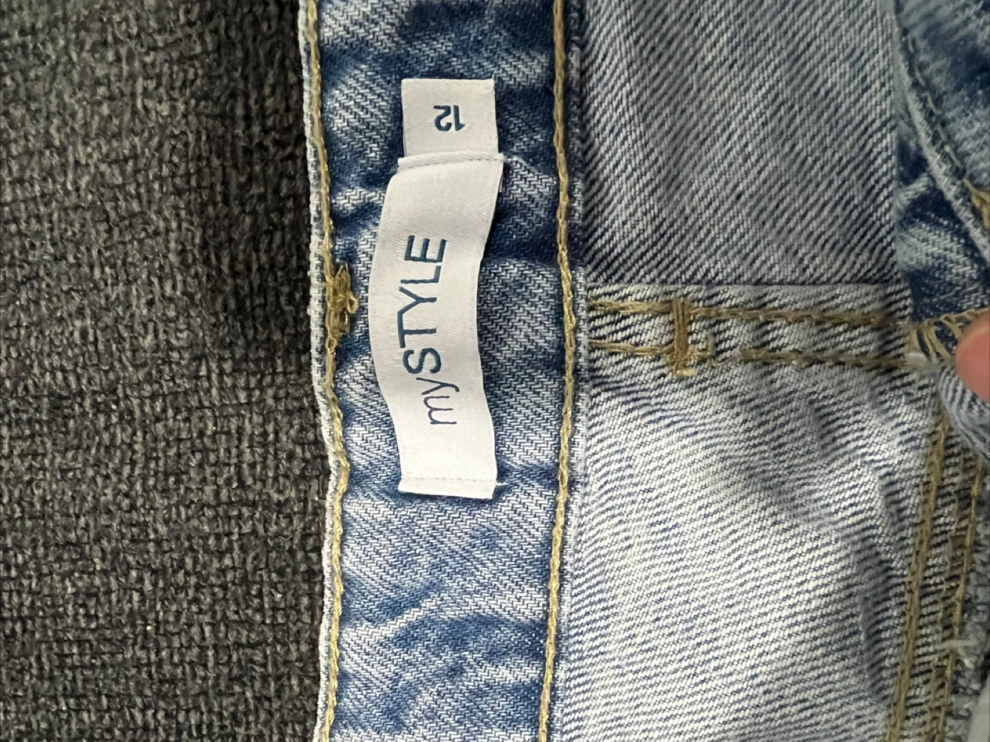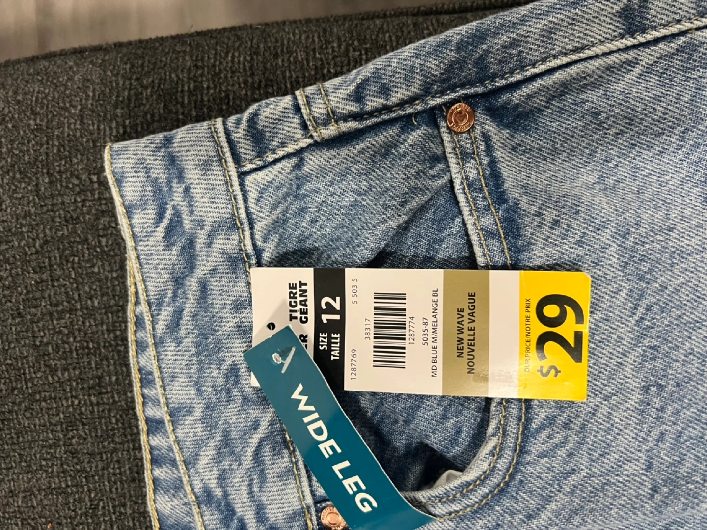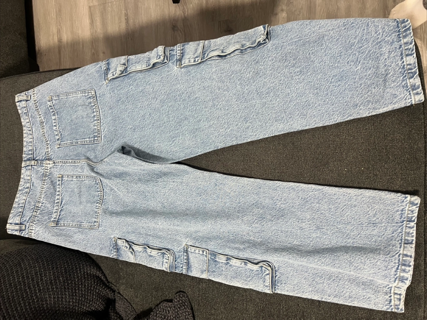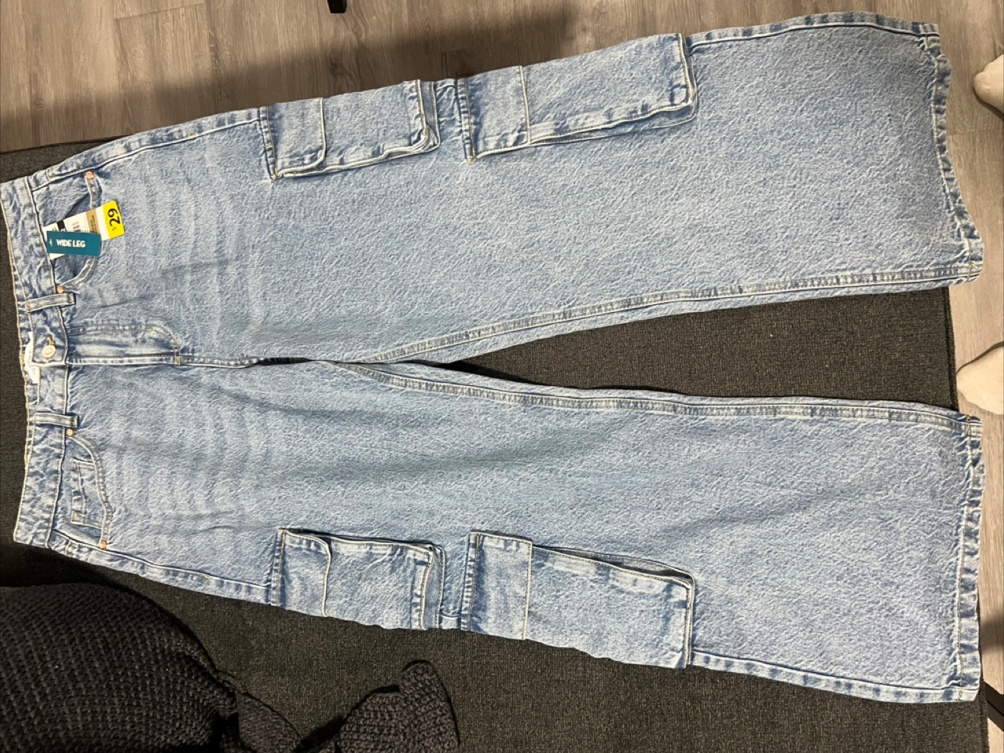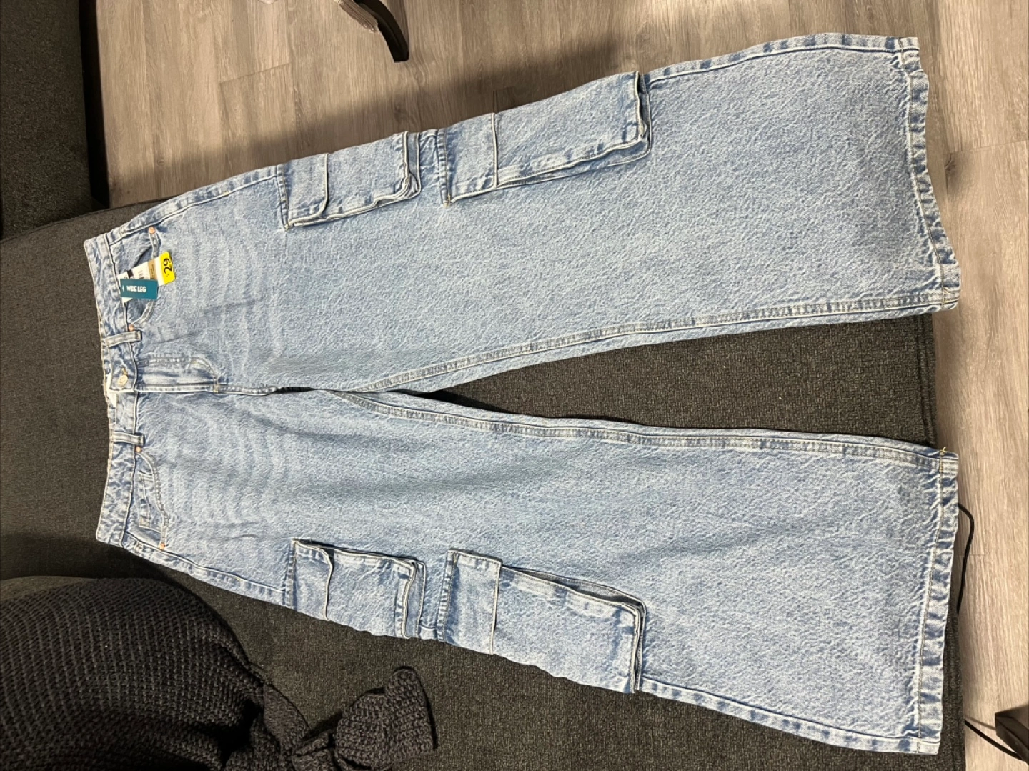 Light wash denim. Multiple cargo pockets. Wide leg fit. Size 12. New with tags.