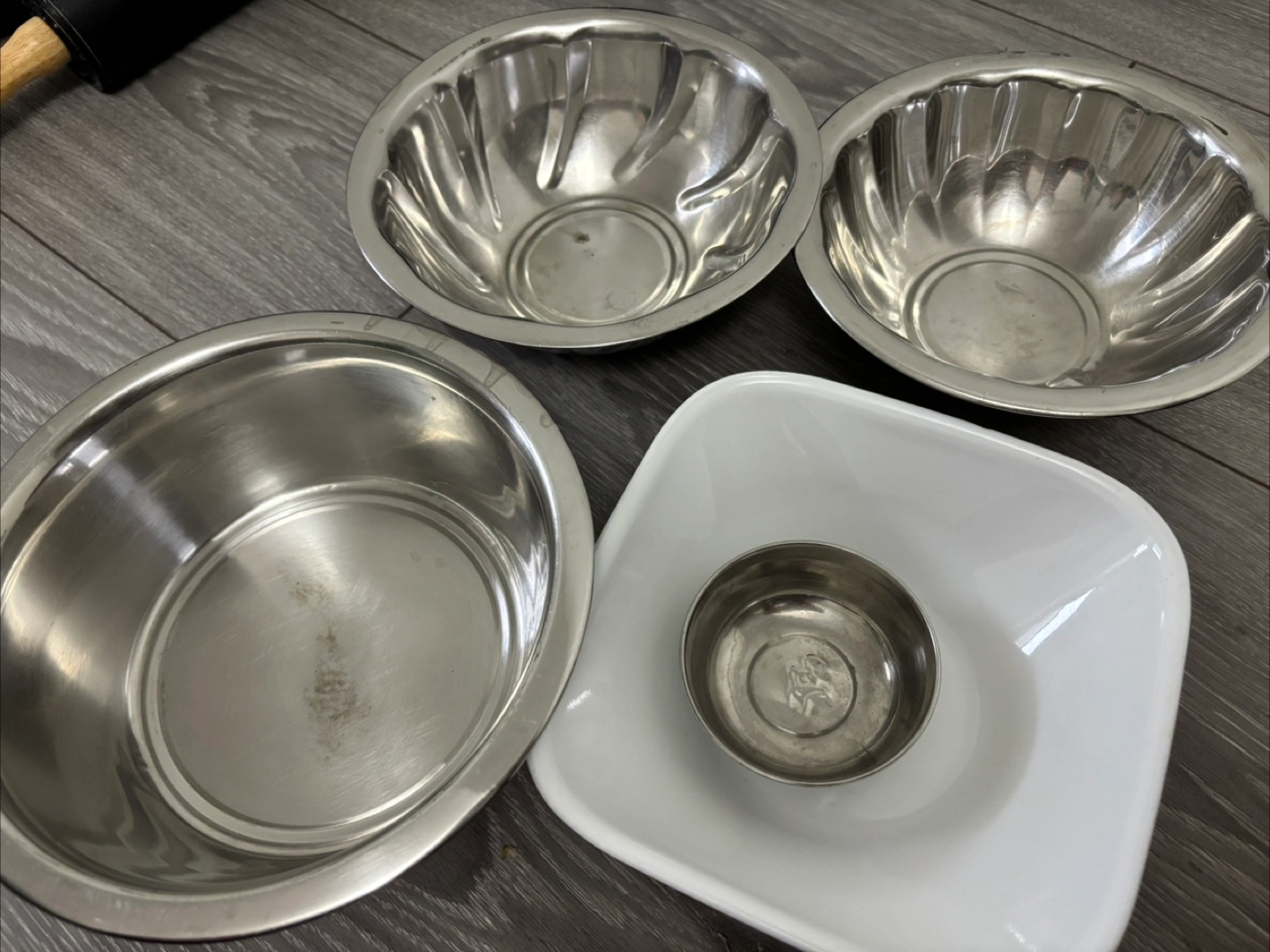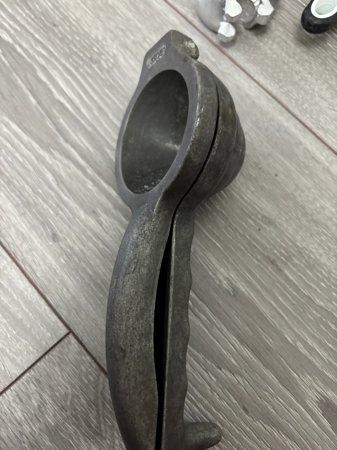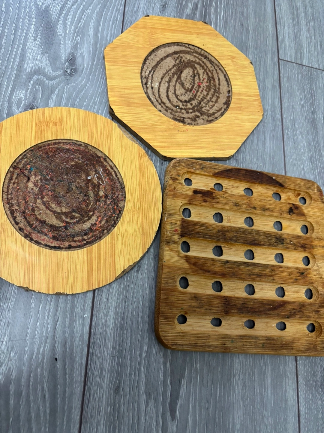 Assortment of kitchen gadgets. Includes a vintage metal citrus juicer, three used bamboo coasters, orange bottle brush, black rolling pin with wooden handles, and a dark brown silicone chocolate mould. Pre-owned, some wear and tear.