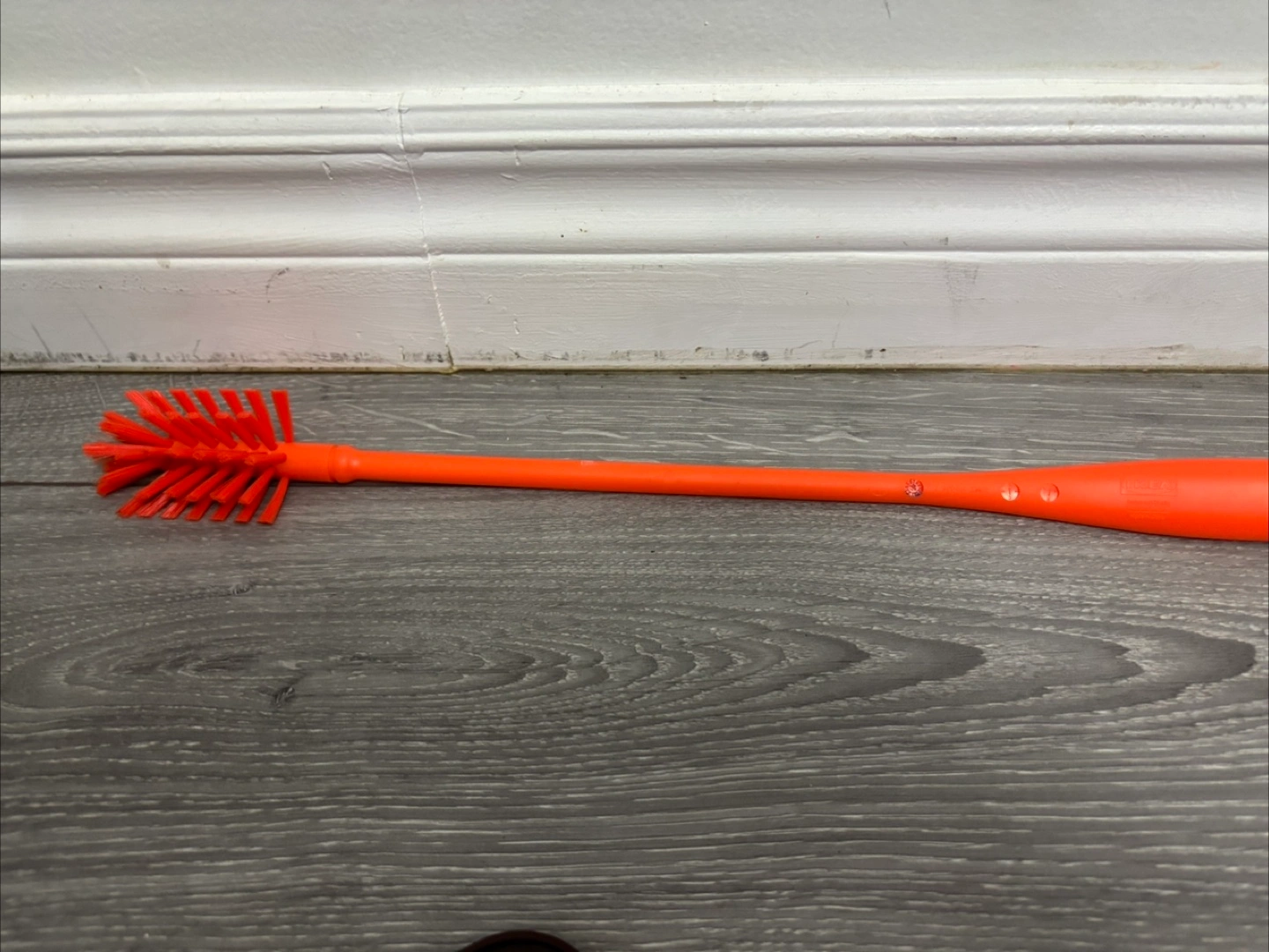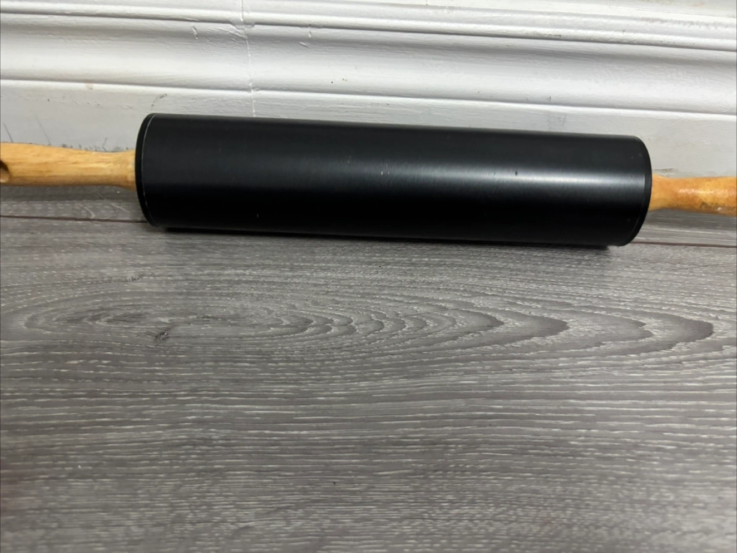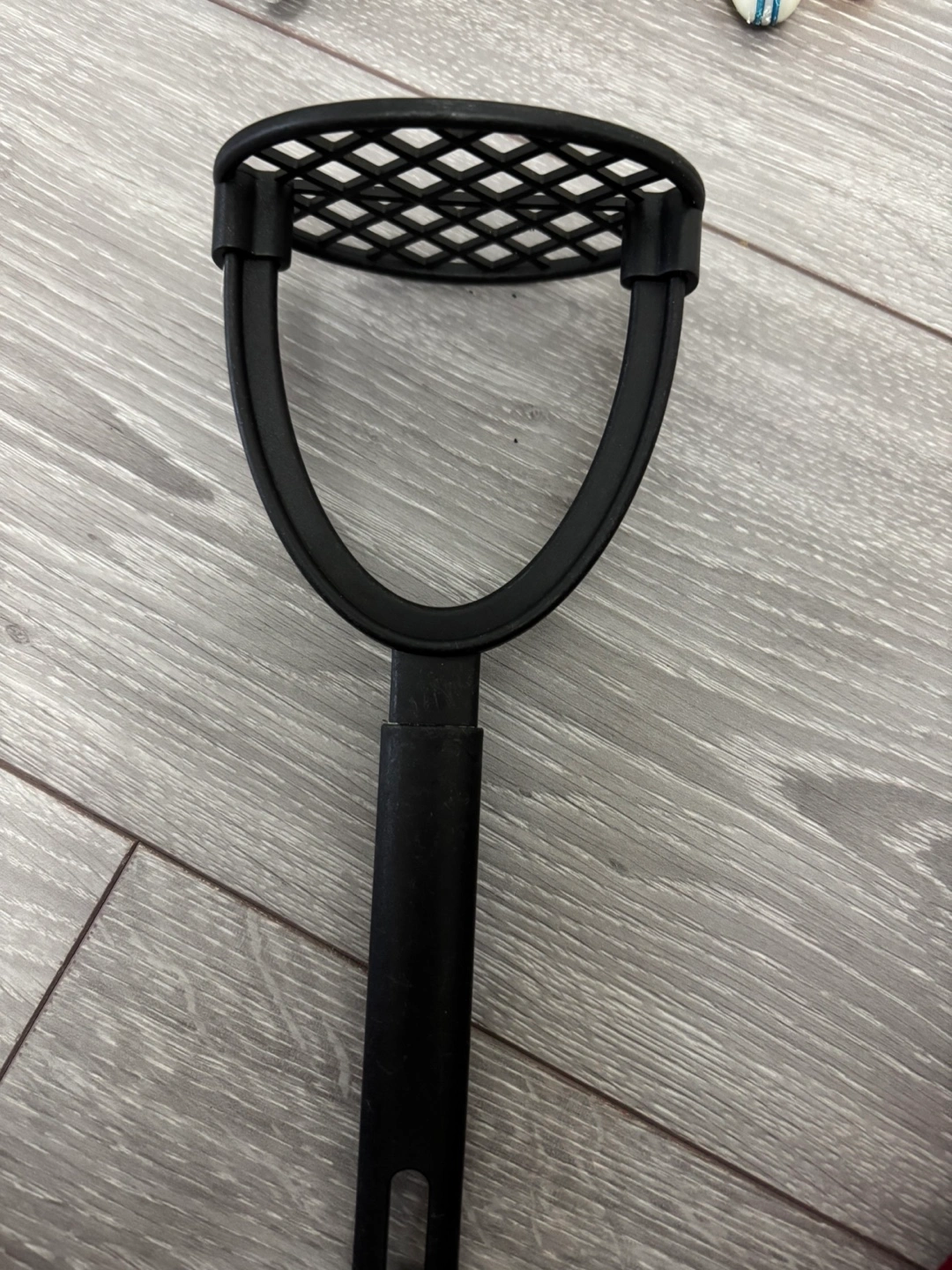 Assortment of kitchen gadgets. Includes a vintage metal citrus juicer, three used bamboo coasters, orange bottle brush, black rolling pin with wooden handles, and a dark brown silicone chocolate mould. Pre-owned, some wear and tear.