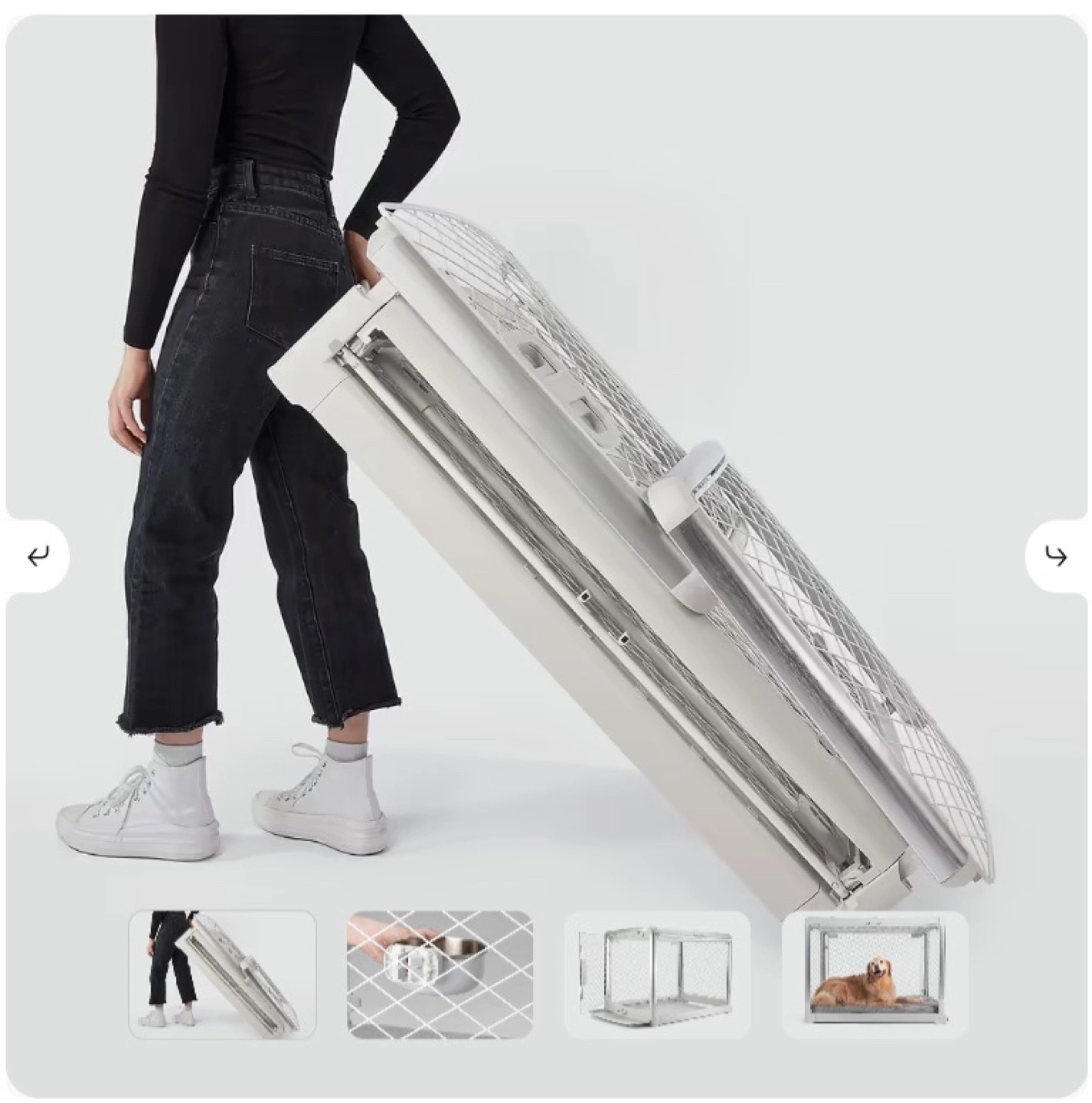 Collapsible dog carrier. Aluminum frame. Easy to fold and store. Great for travel. Includes removable tray.