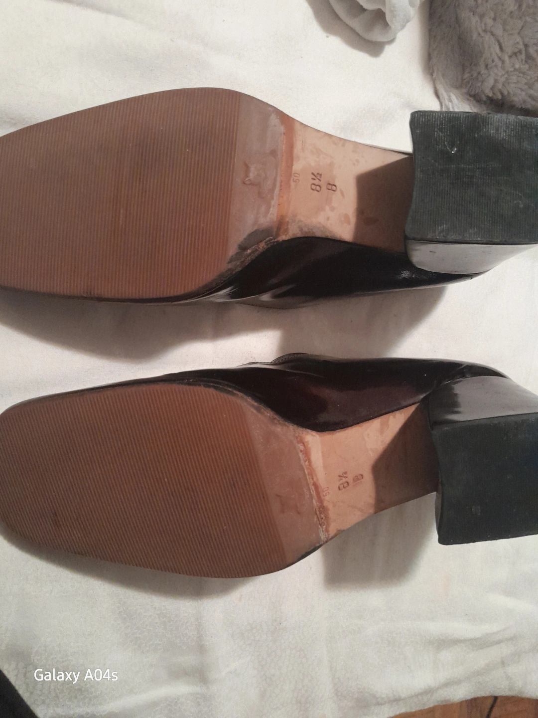 Dark brown patent leather shoes. Size 8. Block heels. Ankle strap detail. Made in Italy.
